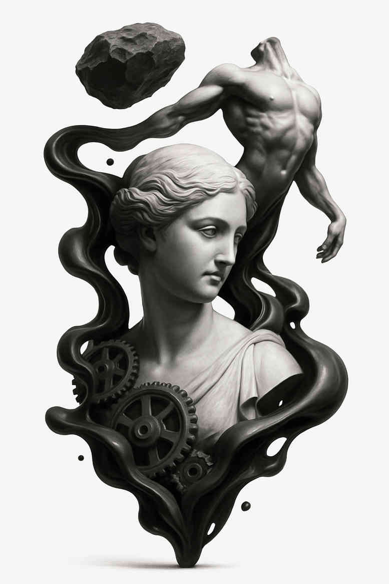 These AI-generated tattoo projects explore a fusion of classical sculpture and machine-inspired imagery. This piece pairs a sculpted statue head with a sinuous snake and interlocking gears, all rendered in black and grey to emphasize form, shadow, and contrast. The statue head conveys timeless wisdom, while the serpent signifies transformation, and the gears symbolize time and inner mechanism. The composition threads the organic and the mechanical through flowing negative space and bold silhouettes, making it suitable for a bold forearm or chest placement. Shading combines precise line work with smooth gradients to achieve a realistic yet stylized look, ideal for fine line tattoo techniques or larger black and grey pieces. While this concept nods to Japanese style tattoo aesthetics in monochrome form, it remains versatile for traditional, neo-traditional, or modern interpretations. The idea can be scaled from a small tattoo to a larger piece and functions as a meaningful tattoo design with a narrative that invites personalization in snake orientation, gear sizes, and lighting direction. The cover-up potential is intrinsic: the dense, intertwining forms establish strong silhouettes that can effectively conceal older ink while preserving legibility after healing. For those seeking meaningful tattoos, this concept offers a flexible template that works as a standalone piece or as a sleeve component, and is well-suited for black and grey ink, realistic tattoo aesthetics, and classic sculpture-inspired imagery. As an AI-generated project, it illustrates how mythic symbolism and industrial motifs can merge into body art that is both striking and durable, with a built-in option for cover-up if needed.