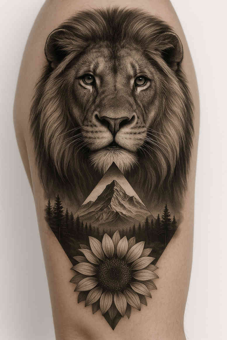 AI-generated tattoo project concept presenting a highly detailed, black-and-grey composition: a majestic lion’s head rising from a mountainous landscape, with a radiant sunflower beneath to anchor the scene. The artwork uses graphite-like shading and smooth tonal transitions to achieve lifelike realism while maintaining a cohesive wrap for the limb. The lion’s mane frames a focused gaze; the mountains convey elevation and endurance; the sunflower introduces warmth, circular rhythm, and a natural focal point. The design relies on fine line work and deliberate negative space to create depth without overpowering contrast, making it a strong candidate for a cover-up where existing ink can be camouflaged by a bold silhouette and organic motifs. Symbolically, the lion represents courage and guardianship, the mountains denote perseverance and balance, and the sunflower stands for vitality and renewal; together they form a meaningful tattoo design that can be expanded with vines, waves, or geometric accents in a custom session. The black-and-grey palette ages well on most skin tones, and the compact center of the composition allows easy adaptation to forearm, calf, or sleeve placements. As a concept from an AI-generated tattoo project, it demonstrates how wildlife combined with flora and landscape elements can tell a personal story while preserving timeless aesthetics. For clients seeking small tattoos or larger works with a classic vibe and strong cover-up capability, this design offers a versatile base to tailor line weight, texture, and size to individual preferences and professional tattooing techniques. The narrative can be enriched with Japanese-style tattoo influences, fine line tattoo techniques, and subtle lotus flower tattoo or rose tattoo design motifs to create a custom tattoo design that honors meaning, symbolism, and enduring body art.