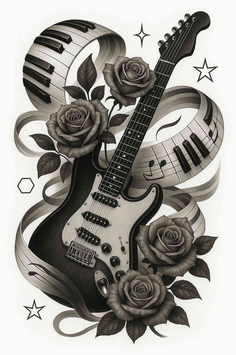 This AI-generated tattoo project presents a bold composition where an electric guitar becomes the central silhouette, its neck entwined by roses and a flowing ribbon motif that echoes a curved keyboard backdrop. Rendered in black-and-grey, the piece relies on smooth gradient shading and strong edge work to achieve a realistic yet graphic tattoo design. The guitar body features a white pickguard and visible pickups, while the roses coil around the neck with layered shading that gives depth and a sense of life. The surrounding ribbons blend into a subtle musical-harmonic atmosphere, suggesting movement and rhythm without distracting from the focal instrument. Symbolically, the guitar stands for personal identity and passion; roses introduce emotion and resilience; the keyboard motif nods to memory and harmony, making this a meaningful tattoo idea for those who relate to music and nature. As a cover-up-friendly concept, the dense dark tones and large dark shapes provide solid masking potential for older ink, and the composition can be scaled to forearm, calf, or back placements while preserving legibility. Technically, the design blends realistic shading with crisp line work for the guitar contours and delicate florals, enabling adaptation to different skin tones and ages of ink. The AI origin is acknowledged, and while the aesthetic leans toward traditional-rock imagery with noir sensibilities, it remains versatile for modern black-and-grey tattoo styles.