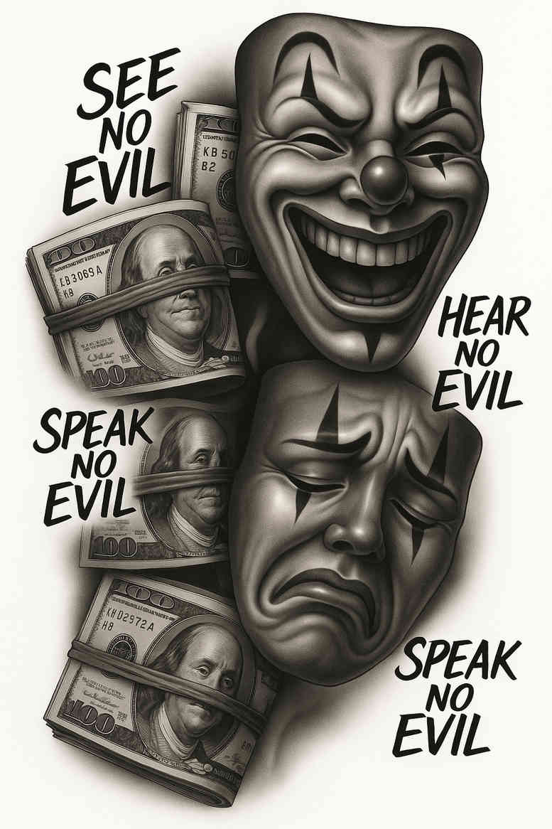 This AI-generated tattoo project presents a dark, dramatic composition that centers on a contorted mask with a broad smile paired with scattered banknotes. Rendered in black-and-grey realism, the piece relies on deep tonal gradients, crisp edge work, and smooth shading to convey texture in cloth, skin, and paper. The three moral-adage motifs See No Evil, Hear No Evil, and Speak No Evil trace a path around the central mask, suggesting a narrative about temptation, secrecy, and the costs of greed. The banknotes contribute a contrasting motif of material desire against the stark, stoic expression of the mask, inviting viewers to read the symbolism as a cautionary tale: the interplay of wealth, vice, and perception. From a tattoo design standpoint, this concept points toward a cover-up-friendly composition: its dense shadows and layered imagery can help conceal existing marks, while the dominant silhouette and strong visual cadence ensure a lasting impact on the skin. For tattoo lovers, the piece functions as a robust body art study in realism, black-and-grey shading, and narrative meaning. It suits a larger panel or wrap-around style, and could be adapted into a custom tattoo design that blends traditional motifs with contemporary ink techniques. In terms of execution, the artwork demonstrates a meticulous approach to contrast—highlights on the mask’s grin, mid-tones on the folds of fabric or the creases of the notes, and deep shadows that anchor the scene. The neutral grayscale supports a timeless aesthetic, aligning with popular trends in black-and-grey realism and fine line tattoo elements when scaled appropriately. This concept also engages with broader tattoo themes such as tribal or Japanese-inspired shading, if desired, yet remains firmly rooted in modern realism. Whether pursued as a standalone piece or as part of a larger sleeve, the design offers meaningful tattoos potential for collectors seeking a striking, symbolic portrait in ink; it reflects a custom tattoo design philosophy that prioritizes story, silhouette, and texture, with AI-generated origin as a modern touch in the world of ink.