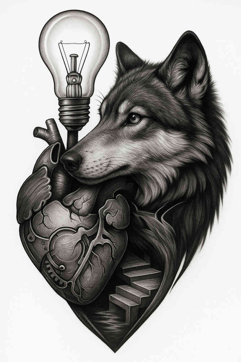 An AI-generated tattoo project presenting a dark, realism-inspired study: a wolf head fused with an anatomical heart and a dangling light bulb, rendered in black and grey ink. The composition centers on the wolf’s gaze and the heart’s vascular shading, while the light bulb above acts as a symbol of insight. The piece relies on smooth grayscale gradients, fine-line tattoo detailing for the heart chambers, and subtle stippling to create depth in fur and shadow. The design reads as a bold chest or upper-arm motif with the heart forming the focal point and the wolf framing it, while the light bulb adds a note of intellect and life force. Thematically, the wolf suggests guardianship and instinct; the heart conveys emotion and vitality; the bulb stands for ideas and enlightenment. The negative space around the trio helps the elements breathe, and the dark areas are intentionally strong to facilitate an effective cover-up when applied over scar tissue or older tattoos. From a technique perspective, this black and grey realism piece uses cross-hatching and feathered gradients to achieve seamless transitions; careful line weight gives the fur a tactile texture while keeping the heart’s anatomy clear. For those seeking meaningful tattoos, this design offers a timeless silhouette with room for personalization: adjust the heart’s ornamentation, tweak the bulb’s glow, or refine the wolf’s expression to match a client’s story. As a flexible concept, it sits comfortably among broader motifs—flowers such as lotus flower tattoo or rose tattoo design, or themes like infinity tattoo and tribal tattoo—yet remains a coherent single narrative. It can be scaled down for small tattoos or expanded into larger body art layouts, appearing as a stand-alone piece or part of a sleeve. Note that this concept is an AI-generated tattoo project; a skilled artist should adapt line weight and shading to the client’s anatomy and skin tone. In sum, this cover-up-friendly composition blends dark realism with symbolic meaning, offering a powerful, versatile design suitable for chest, arm, or back placements, and eligible to be developed into a full custom tattoo design. The piece nods to Japanese style tattoo aesthetics, uses bold blacks and subtle grays as ink, and serves as a strong platform for a meaningful tattoo journey.