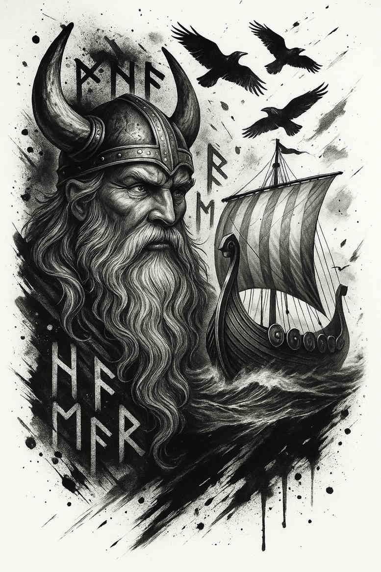 An AI-generated tattoo project showcases a dark, high-contrast composition featuring a bearded Viking with a horned helmet standing at the prow of a storm-tossed ship, while circling ravens punctuate the atmosphere. The dominant figures are rendered in black-and-grey realism, with deep inky blacks, nuanced grey washes, and selective stippling to convey texture, wind, and sea spray. The Viking’s rugged face, intricate helmet, and fur cloak convey ancestral strength, while the ship’s rigging, sails, and carved wood yield a sense of motion and weathered grandeur. The ravens—symbols of mystery and fate—flank the composition, their silhouettes integrating with negative space to create balance and impact. This project leans toward a bold, illustrative style, yet maintains the subtle shading and smooth gradients that characterize modern tattoo design. The piece is adaptable to large skin surfaces such as the upper arm, shoulder blade, back, or chest, where the imagery can wrap and flow with body contours, maximizing storytelling potential. As a tattoo design, it offers meaningful tattoos themes: journey, endurance, and mythic heritage, making it suitable for a meaningful tattoo collection or a custom tattoo design for someone seeking a strong Norse motif. The AI-generated origin is apparent in the crisp linework and cohesive composition, reminding viewers that digital concept art can translate into practical ink through skilled tattoo artistry. For cover-up purposes, the dense blacks and layered shading provide opportunities to blend or obscure old markings while preserving a dramatic narrative. If expanded, the design can incorporate subtle runes or fine-line accents to personalize the piece without sacrificing its bold, black-and-grey character.