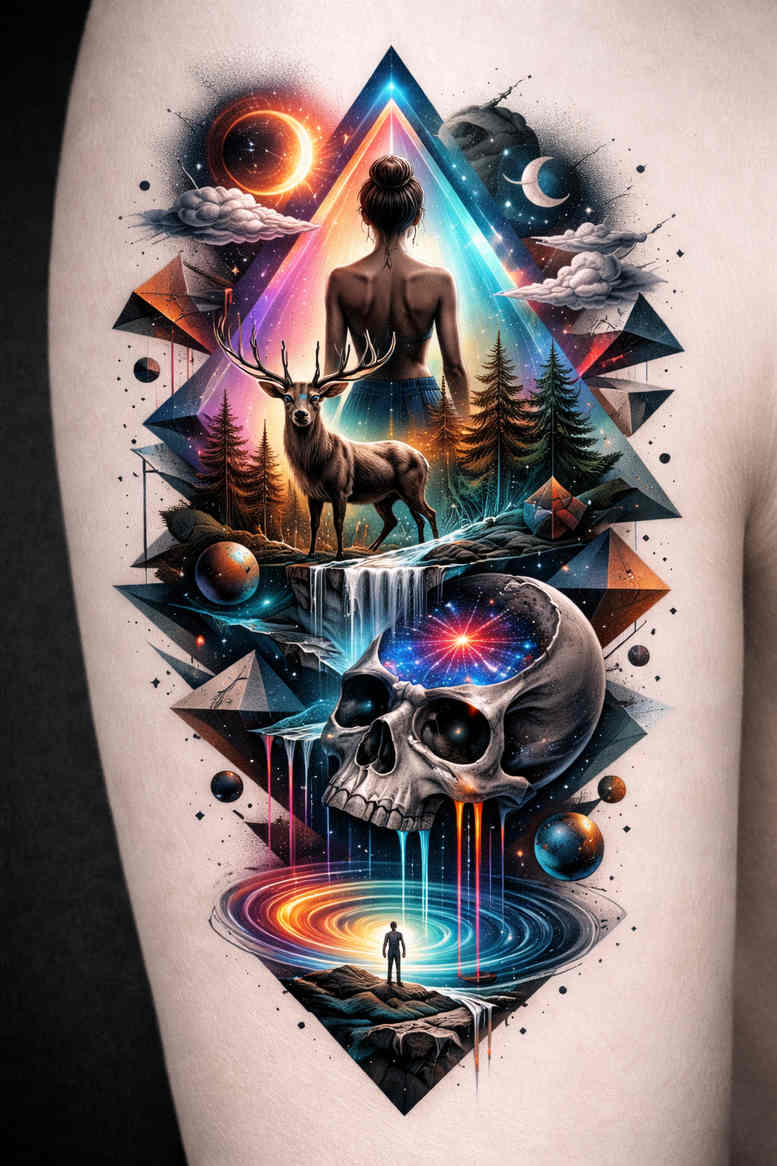 AI-generated concept presented as a tattoo design that blends sacred geometry with a Buddhist motif and a skull motif in a cosmic setting. The central Buddha figure sits in a classic lotus pose, rendered with clean linework and soft shading to emphasize calm presence against a backdrop of precise geometric forms. Surrounding him, a series of equilateral triangles and kaleidoscopic triangles create a calligraphic mandala effect, drawing the eye toward the crown and toward the skull at the base, which grounds the composition in the cycle of life and mortality. The color palette is vivid, with electric blues, purples and pinks meeting warm oranges and yellows to create a solar spectrum that feels both cosmic and spiritual. The skull, detailed with high-contrast shading, acts as a counterbalance to the serenity of the Buddha, reminding us of impermanence while the orbiting orbs evoke celestial bodies—planets, stars and the spiral of galaxies. The contrast between the organic, meditative figure and the precise geometric shapes yields a dynamic tension that is at once contemplative and modern. The outer diamond grid frames the scene, using negative space to separate the Buddha from the skull and to emphasize the tessellated rhythm of the triangles. The orb-like orbs function as focal points that guide the viewer’s gaze along the vertical axis, while the concentric rings within the triangles create a sense of depth reminiscent of lit stained glass. The design blends blackwork outlines with delicate color shifts, enabling the piece to age gracefully while retaining crisp geometry. In terms of symbolism, the Buddha embodies enlightenment, compassion and awareness, whereas the skull anchors the dare to mortality; the triangles channel energy and balance, the orbs symbolize cosmic unity, and the kaleidoscopic composition hints at the interconnectedness of all things. The overall mood mixes mysticism with modern technique, reflecting contemporary tattoo trends toward bright, saturated palettes and graphic geometry. This project is AI-generated as a starting point for a client who wants a dramatic, multidimensional work with strong central silhouette that remains legible at different scales. It would translate well to a full back or upper arm design when sized appropriately, and the color choices can be tuned to skin tone for maximum vibrancy. The result is a striking statement piece that marries ancient symbolism with futuristic aesthetics.