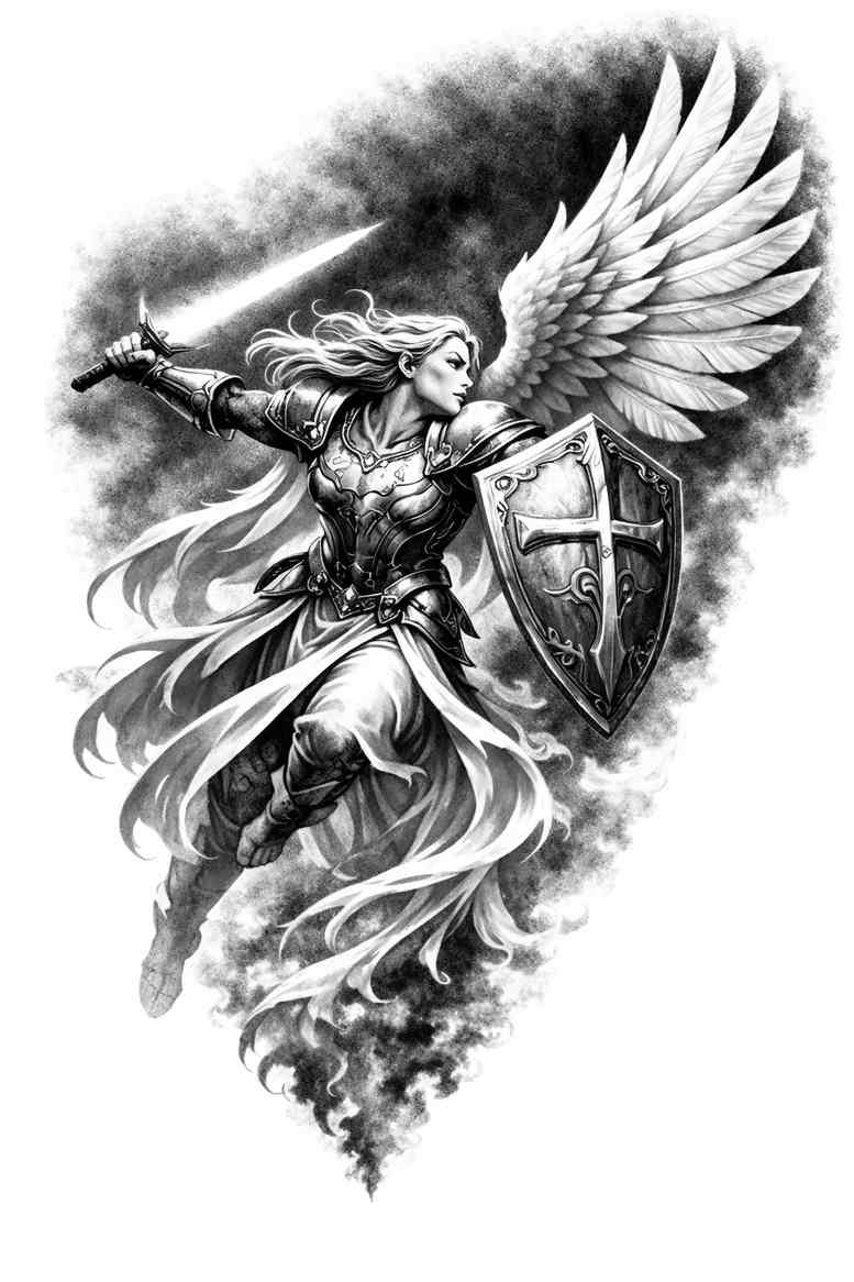 This black and grey realism study presents a central angel figure framed by dramatic shading and a heraldic shield, rendered in grayscale to emphasize form, light, and texture. The composition anchors the figure with a powerful, winged silhouette; the angel’s wings sweep behind, feather detail rendered with fine linework and soft gradations of gray. The shield held at the left suggests protection and authority, while the armored torso and draped garments introduce a dynamic sense of movement and mythic stature. The lighting is chiaroscuro, with high-contrast blacks defining the figure against pale negative space, creating a sculptural relief that reads clearly at tattoo scale. The design relies on smooth transitions between ink densities to convey depth, while crisp edge definition separates the figure from the surrounding negative space. The symbolism speaks to guardianship, spiritual ascent, and the struggle between light and shadow; the wings evoke freedom and transcendence, the shield denotes defense, and the armor hints at discipline and resilience. This concept works well as a standalone piece or as a larger back or chest composition. Because the artwork is presented as an AI-generated concept study, it offers a starting point for a custom tattoo, inviting an artist to adapt line weight, feather texture, and weapon or shield details to individual style and skin tone. The grayscale palette ensures compatibility with classic blackwork tattooing while allowing subtle tonal shifts to maintain legibility over time. Artists can tailor line weight, feather texture, and shield ornamentation to suit a client’s anatomy and skin tone. The grayscale palette ensures timelessness and compatibility with aging ink; the design reads clearly from a distance and remains legible when scaled down on forearms or calves. Note: AI-generated concept study intended for collaboration with a tattoo artist.