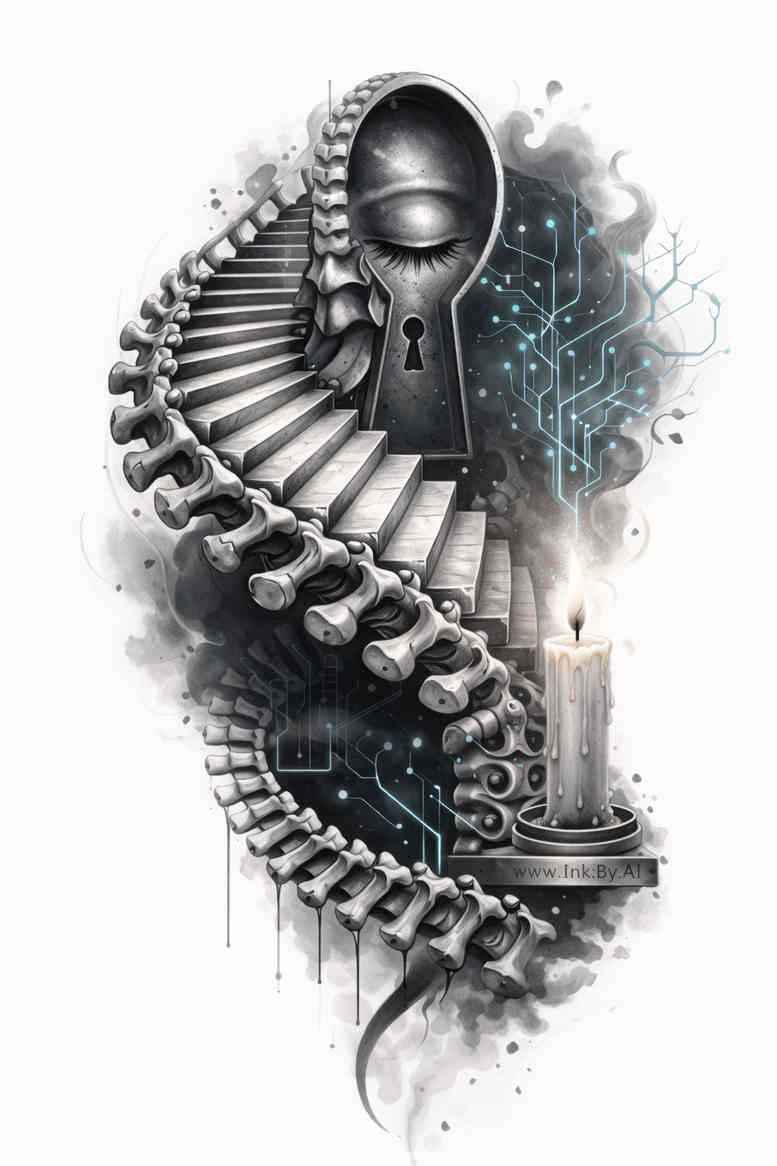 This cover-up friendly biomechanical spine tattoo design intertwines anatomy and machinery in a high-contrast blackwork composition. A central serrated spine coils upward around a skull-like head, its vertebrae rendered as a sequence of weathered gears and metallic plates that merge into wisps of smoke and negative space. The contrast between dense black silhouettes and fine line shading creates a dramatic play of light and shadow, giving depth and motion to the torso or back. The piece reads as a continuous spine, with the gears acting as turbines that suggest energy, resilience, and transformation, while the skull-like cranial form anchors the motif in a macabre yet scientific theme that is signature to biomechanical tattoo aesthetics. The grayscale palette is deliberately restrained; abrupt black areas are balanced by midtones and subtle stippling to preserve legibility across aging skin. The vertical composition favors a natural flow along the spine, enabling placement from shoulder blade to mid-back or along the entire spinal column as a bold, long-form statement. Subtle needlework texture, cross-hatching, and fine-line accents add mechanical detail to the metal elements, while the surrounding skin is treated as negative space to heighten contrast and readability. This design is crafted as a concept piece, AI-generated to explore a contemporary fusion of flesh and machine and to illustrate how a cover-up can be achieved with a dominant silhouette paired with intricate inner detail that reveals itself up close. The motif invites contemplation of transformation and duality, turning a dark history tattoo into a living sculpture where vertebrae, gears, and skull converge into a single, rhythmic organ of form, heightening drama and flexibility for placement on the back, chest, or sides and ensuring longevity through simplified shapes and strategic shading.