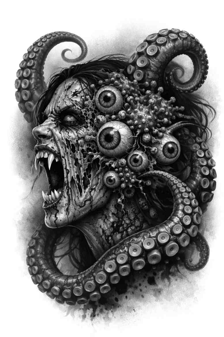 This design presents a dramatic black-and-grey dotwork interpretation of a monstrous octopus head entwined with curling tentacles. The composition centers on a brutal, skull-like visage fused with sinewy limbs, using dense stippling and fine line work to model depth, texture, and form. The tentacles sweep around the head in a dynamic spiral, with suction cups rendered as small circular motifs that create subtle highlights against the darker negative space. The overall effect sits between biomechanical mystery and mythological creature, evoking kraken lore while staying rooted in an inked graphic language. Because the texture relies on dotwork shading, the piece reads as a tactile surface: the head anchors the composition, while the tentacles extend beyond the main silhouette, suggesting motion and confinement. In terms of symbolism, the design can be read as a meditation on control versus chaos, the creature as guardian or menace, depending on placement and color economy. The AI-generated concept explores an intense black-and-grey palette, where variations in density produce tonal gradations without broad blocks of flat black, allowing the tattoo to age gracefully on skin. The piece suits large canvases such as the back, chest, or upper arm; its high-contrast geometry makes it legible from a distance, while the micro-detail rewards close inspection and upon healing can acquire a textured, almost mechanical patina. For a cover-up, the dense black work can effectively obscure old marks, while the surrounding negative space can be used to weave in existing imagery or to bias future additions. This design demonstrates how an AI-generated concept can fuse naturalistic texture with fantastical form, offering tattooers a ready-made blueprint for an enduring, statement piece that remains readable on both pale and darker skin tones. Line weight shifts emphasize the three-dimensionality of the head and the sinuous curvature of the arms, while cross-hatching and micro-dots build subtle shading that simulates skin texture, bone under sinew, and the gleam of wet suction cups. The design’s rhythm mirrors the anatomical flow of the arm or shoulder, allowing the eye to travel from the jagged beak-like mouth to the tip of the trailing tentacle. With placement, the piece can maximize dramatic impact on a shoulder blade or thigh, while the black background can be extended or interrupted to accommodate existing tattoos or scars. The concept reflects contemporary tattoo artistry where AI-assisted ideation informs traditional methods, offering a bold yet adaptable motif for collectors seeking something both ominous and elegant.