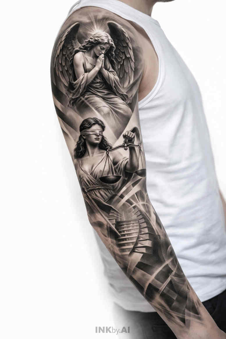 This tattoo design showcases a full-sleeve in black and grey realism, wrapping the upper arm with a commanding figure that exudes stoic strength. The artist uses meticulous grayscale shading to sculpt form, creating textures reminiscent of fabric and metal while maintaining a cohesive monochrome palette. The composition centers on a dominant figure positioned along the length of the arm, establishing vertical movement from shoulder to forearm and guiding the viewer’s eye through layered shadows and midtones. The interplay between solid blacks and delicate grayscale gradients yields a tactile sense of volume, with careful attention paid to how the skin’s curvature interacts with the ink, enhancing readability from various angles. Negative space is exploited to prevent overcrowding, allowing the main silhouette to breathe and ensuring that even micro-details remain legible as the tattoo ages. Symbolically, the piece channels the archetype of the warrior—courage, discipline, and resilience—while the grayscale execution keeps the focus on form, contour, and mood rather than color. The concept is AI-generated, offering a precise, cinematic interpretation that translates well to skin and holds up over time. Given the density of black areas, this design is well suited for a cover-up if needed, as the heavy renderings can effectively mask underlying marks while preserving depth and contrast in the final piece. The sleeve’s rhythm runs along the arm’s axis, creating a seamless narrative that reads as a single image rather than a collage of separate motifs. For collectors who value technical accuracy, anatomical clarity, and a dramatic, timeless presence, this tattoo design embodies a refined balance of anatomy, texture, and storytelling. This description aims to capture the essence of the work for editorial consideration, emphasizing the cinematic lighting, the tactile difference between metals and fabrics, and the enduring impact of grayscale realism on a wearable canvas.