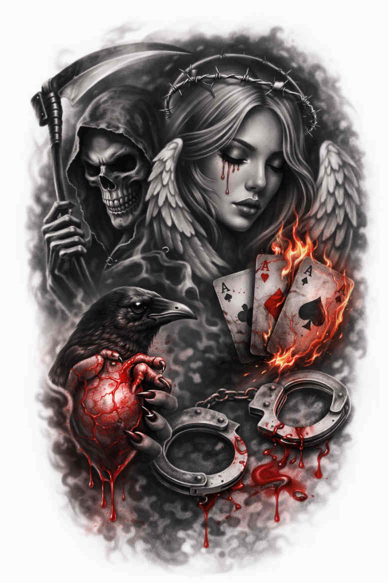 This AI-generated tattoo design uses a stark black-and-grey palette to tell a Gothic narrative of life and death. At the center, a woman emerges in refined realism, her calm gaze counterpointed by the encroaching silhouette of a skeletal figure to the left, its bony fingers curling toward her shoulder in a quiet warning. A vivid red heart punctuates the grayscale field, adding a dramatic focal point and symbolizing vitality within darkness. The composition relies on strong contrasts: deep blacks carve the silhouettes, mid-tones model the contours, and pale highlights lift the faces above the surrounding shadows. Lines vary from fine, precise tracings around the woman’s features to broader, textured shading in the skeletal form, creating a visual rhythm that leads the eye from the upper hairline down toward the heart. The space between figures is carefully balanced to preserve negative space, enabling potential extension into a sleeve or backpiece while allowing for future additions such as petals, filigree, or script inscriptions if desired. The mood is moody and intimate, with cinematic lighting that gives the scene a timeless quality suitable for both classic and contemporary tattoo aesthetics. While the concept is AI-generated, the design’s rhythm and geometry echo traditional storytelling tattoo art—human figure paired with a death figure in an uneasy duet that speaks to resilience, memory, and the inevitability of change. For clients considering a cover-up, the dense blacks offer practical opportunities to blend in or conceal existing scars, while the red accent can be moderated to fit personal taste. In real skin, the piece promises a bold, high-contrast silhouette with nuanced shading that remains legible as it ages, making it an enduring centerpiece for a shoulder, chest, or back project that can grow over time.