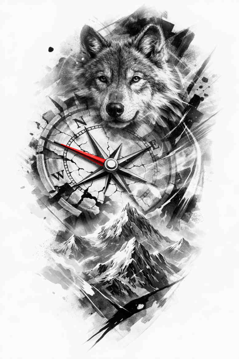 An arresting grayscale study rendered with a watercolor-inspired technique, this wolf portrait rises from a mist of black ink and soft gray washes. The dominant motif is a wolf head, formed by layered shadows, negative space, and splattered texture that mimic fur and motion. A circular clock face threads through the composition, its numerals and ring tracing a rigid geometry that counterpoints the organic flow of the animal. A vivid red clock hand pierces the grayscale field, creating a single, kinetic focal point that anchors the eye and evokes the passage of time. The artwork balances realism and abstraction: the wolf’s gaze carries a life-like intensity while the splashy background dissolves into fog, suggesting speed, instinct, and the raw energy of the wild. The design concept leans into tattoo-friendly readability, with clear silhouette while preserving shading complexity in the fur, eye, and nose. In technique terms, translucent grayscale layers simulate depth and atmosphere, while abrupt ink splatters introduce texture and rhythm. The black-heavy composition makes it a striking cover-up option for larger placements, as bold negative spaces can be used to obscure existing tattoos and reframe the skin with negative space. This is an AI-generated concept, designed for adaptation across sizes from forearm to back, and it invites customization—perhaps a deeper color accent, or additional wildlife elements—while preserving the core symbolism: loyalty and guardianship embodied by the wolf, and the inexorable march of time symbolized by the clock. Viewed as a whole, the composition communicates resilience and vigilance, with the wolf’s profile dominating the upper portion and the clock motif weaving through the lower contours. The choice of a watercolor approach foregrounds mood and atmosphere, allowing soft edges to soften into hard lines where necessary for legibility on skin. The concept can be realized as a sleeve piece or a centered back design, with potential for color localization at the red hand for emphasis. The piece also nods to cultural motifs of guardianship animals and time symbolism, making it appealing to people who value meaning as much as aesthetics. As a concept, it remains AI-generated, offering a flexible starting point for a commissioned tattoo that respects client anatomy and skin tone while delivering a striking, timeless image.