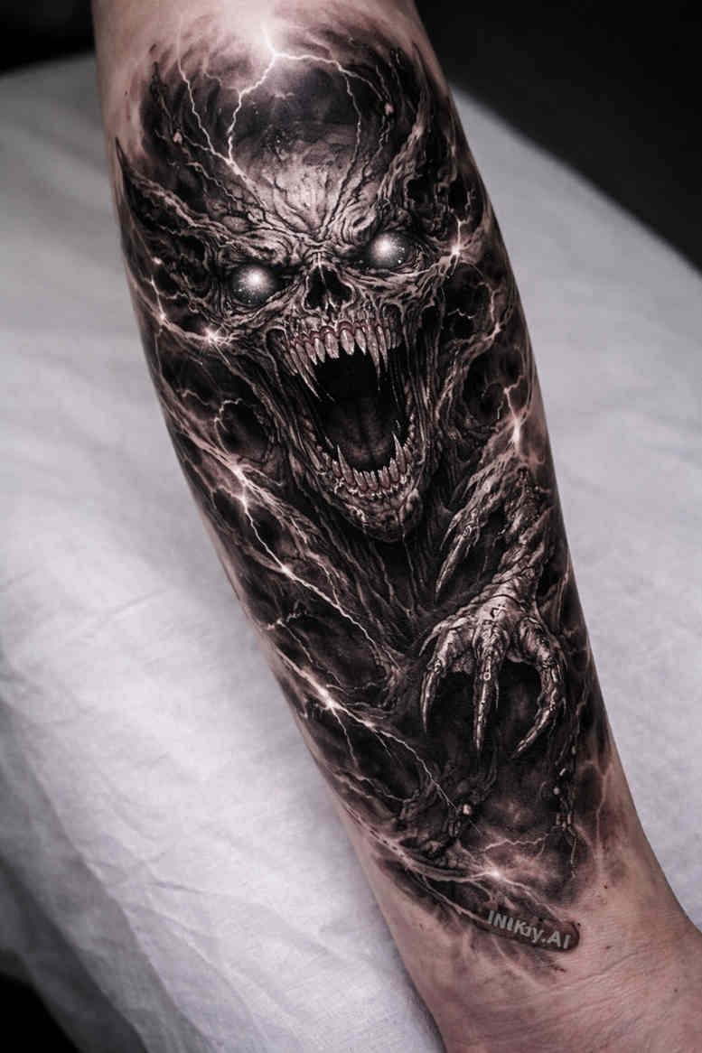 Rendered in deep, sable black with subtle gradients of negative space, this forearm piece centers a wolf-demon head emerging from a field of textured shading. The composition uses a vertical, tapering silhouette that flows with the limb’s anatomy, with the creature’s gaze directed outward to command attention. The features are reduced to bold shapes: a snarling maw suggested by arc lines, piercing eyes rendered with tight black fills, and a fur texture built through layered strokes that read as stitched patterns rather than photographic realism. The style aligns with heavy blackwork: solid blacks, crisp edges, and purposeful contrast between skin and ink. The piece borrows from dark fantasy iconography, fusing canine ferocity with infernal hints, a motif often associated with endurance, guardianship, and the shadowed facets of the psyche. The forearm’s canvas is used as a tall stage, allowing the head to anchor at the elbow with a crown of negative space along the cheek and brow that lifts the whole design. The shading technique relies on plate-like blocks of ink, crosshatched stippling, and micro curves to create a sense of depth without color. The concept works as a tattoo design for someone seeking a bold, monochrome emblem that remains legible at any distance. Since these designs are AI-generated, they explore the intersection of machine imagination and traditional tattoo storytelling, producing a dramatic yet wearable image for lovers of dark fantasy. This piece is particularly suited for cover-up work given its abundant black grounding; it can obscure older ink while preserving a recognizable silhouette of the original form. The result is a striking, durable graphic that communicates power, mystery, and resilience through a single, striking motif.