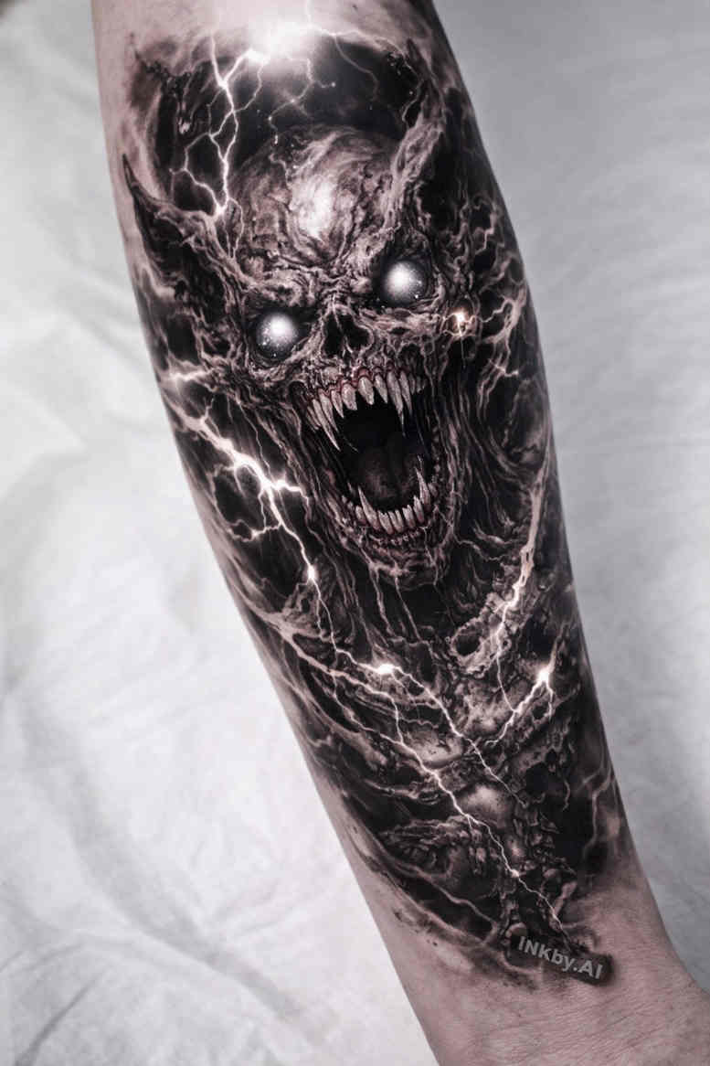 An ominous demon skull dominates the forearm, rendered in high-contrast black and grey ink with dense blocks of tone that push the figure forward against the skin. The central visage fuses a snarling skull with demonic features: jagged teeth, hollow eye sockets, and a brow line sharpened by negative space, while wisps of shadow braid around the edges to suggest smoke, bone, and fractured stone. The composition runs along the arm’s natural axis, with the largest mass anchored near the lower forearm and tapering toward the wrist and elbow, creating a cinematic vertical rhythm that invites closer inspection. Techniques draw on heavy blackwork: saturated fills provide almost opaque black fields, while crisp linework defines the teeth, eye sockets, and the gesture of the mouth; gradual grey washes carve subtler planes, giving the demon a sense of depth without losing the graphic punch. The design embraces both realism and graphic abstraction, allowing the creature to read as a mythic force while remaining legible at typical tattoo sizes. The skull’s crumbling aspects, sharp contrails of smoke or energy, and the interplay of light and shadow convey a sense of ancient power and inner struggle, making the piece rich in symbolism for those who see it as a shield against negativity or a reminder of transformation. Because the concept is AI-generated, the initial sketch explores an otherworldly mask forged in ink, a study in texture, density, and silhouette that translates well to skin and age gracefully with time. From a practical standpoint, the dense black areas offer a robust canvas for a cover-up, masking prior tattoos and providing a bold stage for future additions where darker shapes can be softened or overlaid as desired. The result is a striking forearm piece that balances menace with mastery, designed to stand out in a sleeve or as a commanding standalone statement while remaining adaptable to the wearer’s evolving narrative.