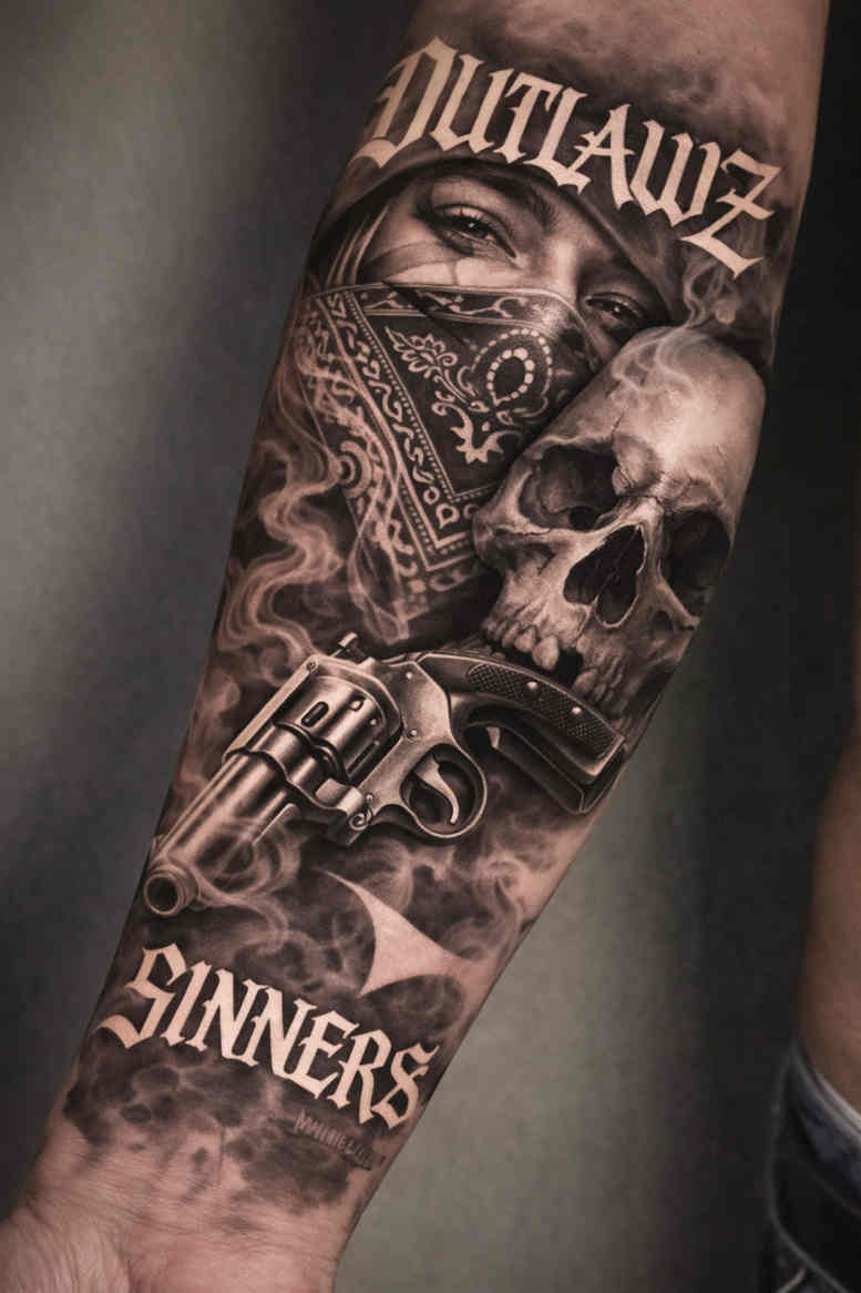 An imposing biomechanical forearm piece, this design fuses anatomy with engineered detail in a dramatic black-and-grey spectrum. The composition centers on two skull forms that confront the viewer, their hollow eyes threaded by a lattice of riveted gears, pistons, tubes, and conduits that weave through bone as if they belong to a single living machine. The artist builds volume through dense black fills, smooth gradients, and crisp white highlights that mimic polished metal, while negative space carves breathing room between elements so the eye can travel along the machinery path. Each cog and cap screw is rendered with micro-shading and fine line work to achieve a convincing metallic texture, and the interlocking chains create an architectural grid that anchors the scene to the forearm’s natural contour. The overall silhouette reads as strong and graphic, with the upper skulls forming a bold focal point and the gearwork spiraling downward toward the wrist, guiding the viewer through a rhythm of circles, rings, and linkages. Symbolically, the piece explores transformation and resilience: mortality tempered by industry, flesh fused with steel, an allegory for endurance in a modern, technology-obsessed world. The color language remains strictly black and grey, prioritizing contrast, texture, and tonal variation over hue to evoke a moody, timeless atmosphere. The treatment blends broad, flowing shading with stippled textures in the shadows to suggest brushed steel, iron, and worn patina, while the hard edges of the gears convey precision and mechanical inevitability. Framed as an AI-generated concept, the artwork pushes the boundaries of traditional tattoo design by presenting a cohesive, narrative-driven biomechanical scene that remains legible at the forearm’s scale and when viewed from a distance. Given its dominant black areas and compact composition, the piece is ideally suited for a cover-up on many skin tones, enabling the wearer to transform an older mark into part of the machinery rather than erase it, while still delivering a striking, high-impact statement suitable for collectors of industrial, gothic, or science-fiction aesthetics.
