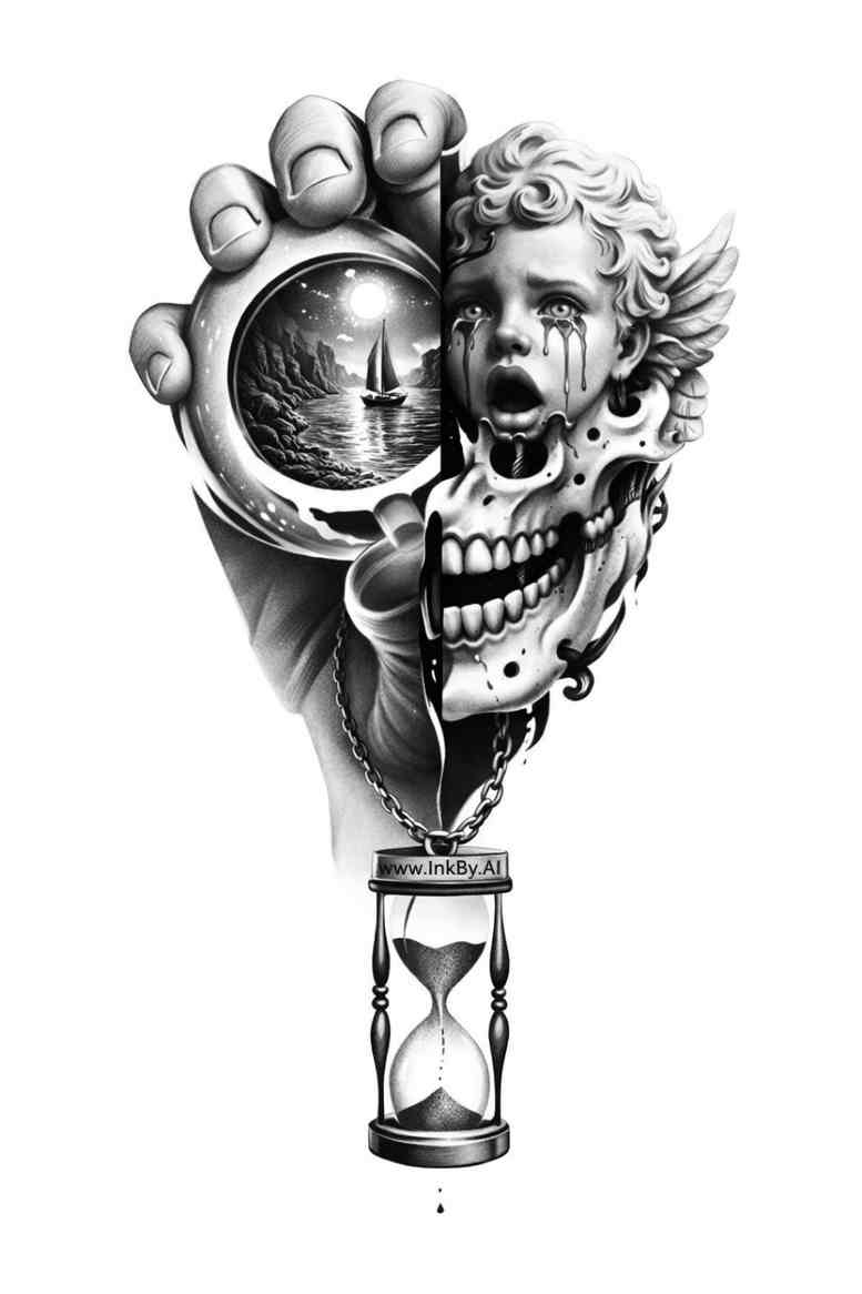 This tattoo concept presents a stark, black-and-grey study that fuses a clenched hand with a skull and an hourglass, creating a dynamic tableau that invites contemplation of time, mortality, and resilience. The hand dominates the composition, its fingers curling around a skeletal skull whose teeth and eye sockets loom with quiet intensity, while a slender hourglass hangs from a chain at the base, its sands suspended as if time itself trembles in the balance. Rendered in a high-contrast realism style, the piece relies on carefully modeled light and shade to sculpt muscle, bone, and fabric with tactile precision; bold outlines anchor the forms while soft gradations capture subtle textures on skin, bone, and rope. The design leans into deep shadows and crisp highlights to create a moody, almost sculptural effect, suitable for chest or forearm placement where diagonal energy can flow with the body. The imagery carries symbolic weight: life, death, and the inexorable passage of moments; the hourglass reinforces the idea that time is finite, while the hand suggests human agency in shaping fate. Because the concept is AI-generated, it embodies a contemporary approach to tattoo ideation, blending algorithmic suggestion with traditional motifs to produce a powerful, repeatable template for a real-world tattoo. The composition’s geometry—curving arcs of the hand, the circular skull, and the vertical line of the hourglass—creates a rhythm that guides the viewer’s eye from the top of the fist through the center to the dangling pendant, inviting close inspection of linework and shading. This piece would work well as a standalone design or as a starting point for a larger sleeve, and it demonstrates how classic motifs can be reimagined through modern techniques while preserving timeless symbolism.