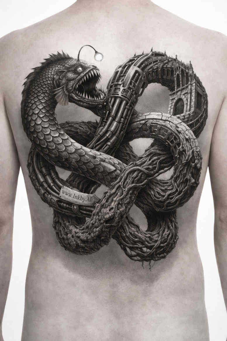 An imposing back-piece design rendered in black and grey realism, this tattoo features two serpents coiling into an intricate knot as their bodies loop and cross to form a circular trefoil. The artist’s attention to scale texture and musculature creates a lifelike play of light across glistening scales, with subtle highlights along the spines and fierce, gaze-filled eyes captured in grayscale. The composition centers the entwined snakes in a dynamic X-shaped arc, with the heads and tails peeking from the margins to guide the gaze around the central knot. The negative space around the coils enhances depth and emphasizes the spherical rhythm of the interlacing forms, while the outer shading builds a chamfered backdrop that makes the figures pop against the skin. Symbolically, serpents and knots evoke eternity, rebirth, and duality, suggesting cycles of life and transformation; the two figures may represent opposing forces united in balance, a theme often explored in mythic and philosophical tattoo storytelling. The grayscale palette leans toward photorealism with smooth gradations from near-black to pale graphite, delivering a high-contrast piece that reads as a timeless silhouette up close and a dramatic silhouette from a distance. The texture work—tiny scale patterns, subtle rimming, and soft feathering along the edges—adds depth without flattening the forms, while the meticulous line work keeps crisp edges where the light catches the curvature of the serpents. This design is AI-generated, presenting a concept that reads as a complete narrative on skin, and given its dense black field and sweeping coverage, it is perfectly suited as a cover-up-ready motif that can be manipulated to blend with or conceal older tattoos. The piece embraces a classical yet contemporary vibe, bridging legends and modern tattoo craft through a visually relentless, statement-ready composition.