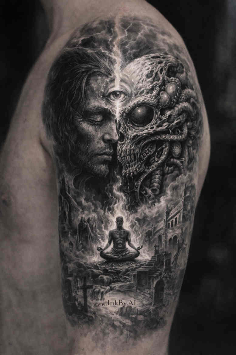 This black and grey realism piece presents a two-panel narrative stretched across the upper arm: on the left, a lifelike portrait emerges in soft, meticulous shading, while on the right a skeletal skull blooms from shadow and line work. The composition is bound together by a muted seascape at the base, where a lone boat carves a quiet path through waves. The contrast between flesh-toned realism and the textured, bone-gray skull creates a dynamic tension that invites closer inspection, a hallmark of contemporary tattoo storytelling. The artist uses a restrained tonal range to model form, with careful emphasis on light catching the cheekbone, the brow, and the teeth, while the skull relies on ash-like gradients and brisk needle-work for volume. The design flows with the natural curvature of the arm, allowing the portrait to sit prominently as the focal point, while the skull becomes an offset counterweight that completes the narrative of life and mortality. Symbolically, the portrait alludes to dual identities or guardianship, whereas the skull evokes mortality and transformation; the boat and water suggest a journey or passage, taking the observer from shape to shape across the canvas. This concept is AI-generated, reflecting an explorative approach to contrast and composition, and it carries a strong cover-up potential due to its dense atmospheric shading and large areas of black that can be leveraged to conceal existing ink beneath. The final result reads as a cohesive, magazine-ready piece that marries technical precision with symbolic depth, appealing to fans of realism, dark romance, and myth-inspired storytelling. Beyond aesthetics, the piece is designed with a deliberate rhythm: the left portrait uses subtle sfumato-like blending to soften transitions, while the right skull relies on crisp line-work and stippling to create a bone-dust texture. The wet-look of the water is hinted with light reflections and tiny highlights, achieved by layering multiple passes of shading to build depth without overpowering the central subjects. For tattoo studios, the piece offers practical benefits: it reads clearly from a distance, retains detail when scaled up or down, and provides a seamless anchor point for future sleeves by offering integrated negative space and natural motion along the arm. As an AI-generated concept, it demonstrates how algorithmic ideas can inform traditional skills, producing a design that feels both timeless and contemporary. The cover-up potential is significant: the heavy black areas around the skull and the boat’s silhouette can be tuned to obscure prior work, while still preserving the identity of the new portrait. The palette stays within grayscale, allowing shading to convey mood through temperature rather than color, which is ideal for clients seeking a sophisticated, versatile tattoo. In short, this tattoo design is a bold exploration of duality, journey and mortality, realized through black and grey realism that merges portraiture with symbolic iconography in a single, cohesive sleeve-friendly composition.