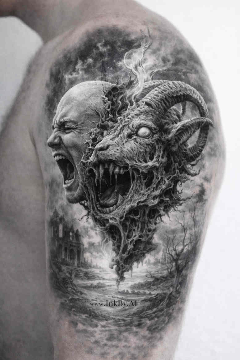 AI-generated concept for a bold, high-contrast blackwork tattoo design featuring a ferocious wolf head dominating the right side and a screaming man on the left. Rendered in grayscale, the piece uses solid blacks for the wolf silhouette and layered gray washes to sculpt fur texture and depth, while the human profile relies on crisp lines and deep shadows to maintain legibility against a dense ink field. The composition plays with negative space and a stormy aura that seems to swirl between the two figures, suggesting an inner conflict or coexistence of predator and prey. The design adheres to classic blackwork principles: strong silhouettes, minimal color, careful contrast, and a disciplined approach to shading that reads clearly from a distance and remains legible up close as lines age. The choice of placement on the upper arm or shoulder allows the wolf to wrap around the contour, while the man’s profile anchors the opposite hue plane, producing a dynamic, shield-like silhouette when viewed in full. Symbolically, the wolf evokes ferocity, resilience, and wild instinct, while the human figure represents fear, restraint, or moral struggle, making the piece suitable for listeners drawn to mythic or cinematic narratives about the beast within. This AI-generated tattoo concept functions as a project idea and emphasizes that it is well suited for a cover-up over darker, existing ink thanks to its dense black geometry and uniform shading. For those seeking a striking, timeless design, the fusion of savage energy and human vulnerability offers a bold visual statement that holds up under aging skin and across reworkings.