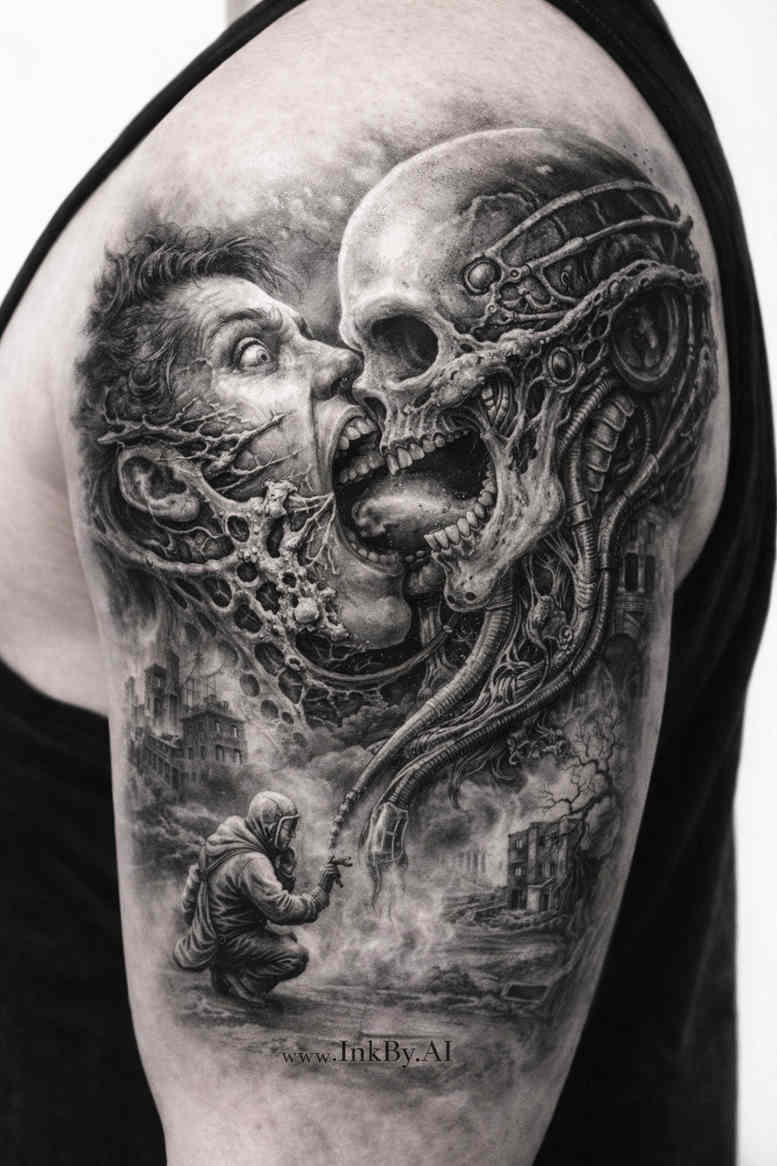 This black and grey realism piece presents a grayscale study of mortality fused with a winged demonic silhouette, conceived as an AI-generated concept and executed as a bold grayscale composition on the upper arm. The dominant element is a meticulously shaded skull, its cranium rendered with bone texture and micro-contrast that yields a convincing three‑dimensional appearance. Behind and around the skull, a winged form unfurls, its sinewy lines and feathered edges dissolving into smoke-like shadows that trace the contours of the arm. The design relies on strong chiaroscuro transitions, with deep blacks anchoring the composition and cool greys guiding the midtones to create convincing depth. The contrast between smooth bone surfaces and rough, graphite-like shading emphasizes texture: the eye sockets feel hollow yet alive, while the winged silhouette injects motion and a protective, ominous mood. The piece reads as a narrative of duality—life and death, angelic and infernal energy—presented in a compact, circular flow that works well along the upper arm. While rooted in traditional tattoo iconography, the shading is contemporary and photorealistic, capturing subtle gradients, skin textures, and reflective nuances that stay legible over time. The negative space around the skull helps push the focal point forward while giving the design room to breathe on the skin. Given the density of black areas, the tattoo is also strongly oriented toward cover-up potential for older work in the region; the heavy black mass can obscure previous ink effectively, while the detailed midtones provide a realistic focal point that remains legible with time. As an AI-generated concept, the design blends algorithmic precision with human artistry to achieve a balanced composition that remains expressive and durable long term. The result is a versatile piece that can be scaled and adjusted to suit different arm shapes, offering a powerful grayscale motif for someone seeking a bold, dramatic statement in black and grey realism.