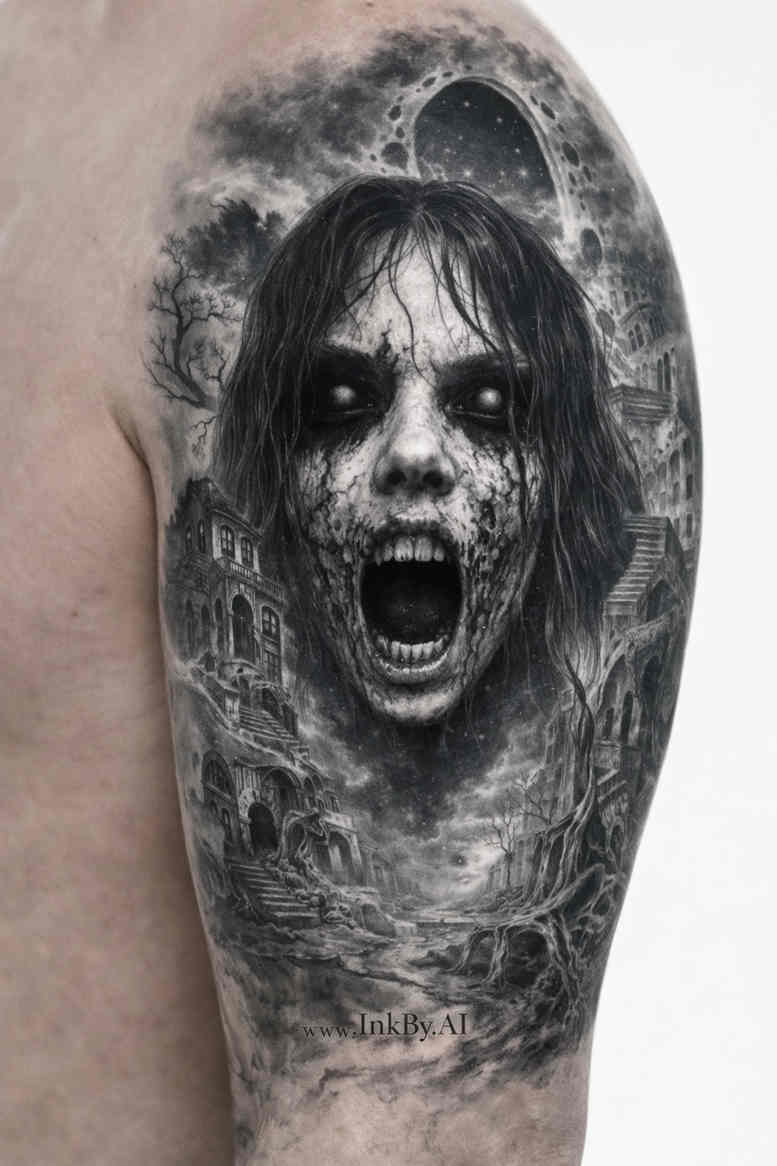 This tattoo concept presents a visceral grayscale portrait of a screaming face locked inside an oval cameo, executed with restrained line work and layered shading to carve bone, tissue, and emotion from a field of deep blacks and smoky midtones. The composition centers on the open mouth and glare of the eye sockets, forcing the viewer’s gaze through the oval frame as if peering into a stormy psyche. The surrounding darkness functions not as filler but as part of the narrative, creating negative space that enhances contrast and gives the figure an almost sculptural presence. The technique leans heavily on black-and-grey realism, with smooth gradient transitions, stippling for texture in skin and hair, and crisp edge work that preserves legibility when scaled up on larger canvases. The oval cameo motif nods to vintage portraiture, while the subject’s feral scream injects contemporary horror energy, producing a design that feels both timeless and modern. As an AI-generated concept, this design demonstrates how a restrained palette and precise shading can convey mood and movement without color. Because the piece is dominated by solid black areas, it is particularly well suited as a cover-up concept where existing ink is being reimagined into a dramatic new image. The composition offers flexibility for placement on the upper arm, shoulder blade, or thigh, and the framing allows additional elements to be layered later if desired. In short, this tattoo design couples a classic cameo structure with a fearsome focal point, delivering a scalable, impactful image that resonates with fans of dark realism and dramatic portraiture, and it reads cleanly at both small and large sizes. The symbolism of a screaming visage within a closed frame evokes release from inner torment and transformation, while the stark contrast between inked shadows and pale highlights amplifies mood and narrative resonance.