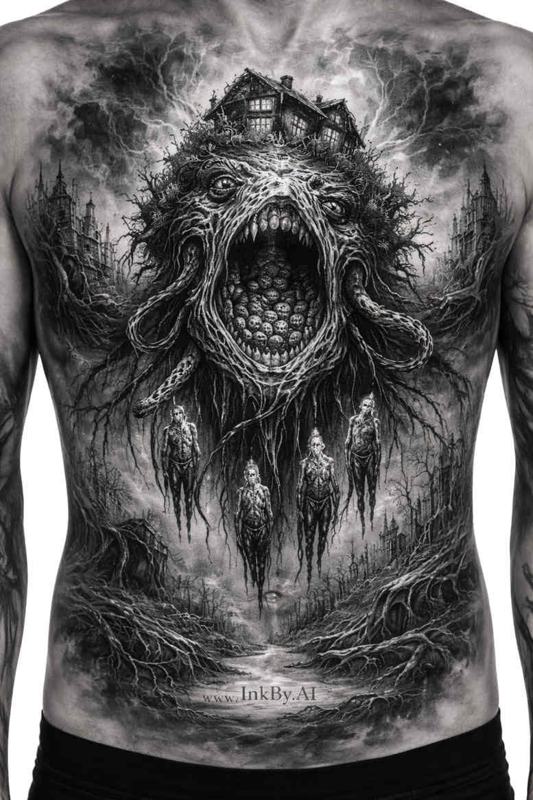 An AI-generated concept rendered in dense blackwork, this demon maw tattoo occupies a broad swath of the chest, weaving a circular, gaping mouth at the center with layered teeth and a spray of radiating spires that bleed into the surrounding shading. The design embraces high-contrast black ink with careful negative space to sculpt depth, using stippling, cross-hatching and crisp outline work to create texture in the inner throat while the outer frame mimics jagged ice or roots cascading along the sternum and ribs. The composition reads as a single immersive macro-motif: a feral entity suspended in a tight circular form, its maw open as if to devour the viewer, while the surrounding jagged elements provide motion and frame. Symbolically, the demon figure can represent inner power, transformation, or confronting fear, while the radiating geometry anchors the piece to the chest as a bold centerpiece. The tone skews dark and dramatic, but the arrangement preserves legibility from a distance, maintaining impact when subject wears shadow or lighting shifts. The dense black foundation offers excellent cover-up potential, capable of masking older inks and creating a seamless silhouette under new layers, a practical consideration for clients with existing work. Technically, this concept explores balance between brutal mass and intricate detail; the mouth remains the focal point, teeth gain texture through micro-etching, and the surrounding fringe acts as a visual wind that keeps the eye moving across the torso. As a concept, the piece demonstrates how AI-generated designs can inspire tattooers to adapt scale, line weight, and portrait-like expressivity to individual anatomy, skin type, and personal meaning. In short, it delivers a cinematic, mythic mood—a dark allegory of power and endurance—while offering a ready-made template for a dramatic chest piece that commands presence from close inspection to distant gaze.