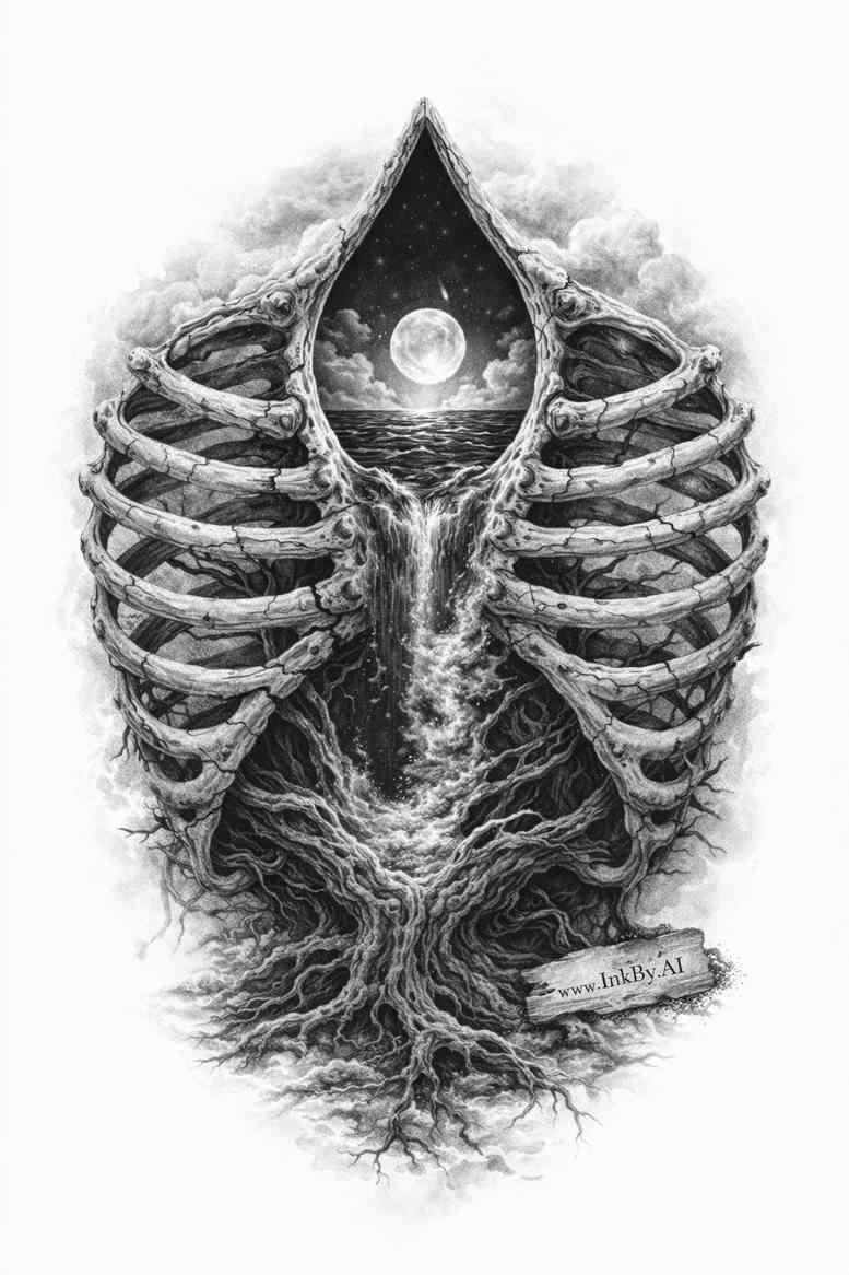 This piece is a high-contrast blackwork study focused on anatomy and metamorphosis, rendered as a lean vertical composition that centers a skeletal ribcage with a mysterious central orb and an emerging silhouette. The ribcage dominates the upper body with dense, inky fills that carve the osteo texture through stark lines and careful cross-hatching, while negative space around the spine creates a breath of air that keeps the mass readable from a distance. In the sternum area a circular orb acts as a focal point, suggesting inner light, energy, or a contained secret, and a slender silhouette rises from the bones to evoke a transcendent form or spirit, achieved with a combination of contour lines and solid blacks. The surrounding shading escalates into a smoky gradient on the outer edges, anchoring the design and enhancing the dramatic mood. Symbolically, the work pairs mortality and resilience—the bone structure as framework for life, the circle as eternity, and the figure as a guardian or aspirant emerging from the scarred anatomy. The piece demonstrates the hallmarks of blackwork: dense black fills, crisp linework, and a strong tonal contrast that remains legible in tattooing, with a modern twist provided by AI-generated planning that optimizes balance, symmetry, and edge clarity for long-term aging. It is intentionally versatile for a stand-alone chest or back piece, but the clean silhouette also makes it an excellent base for future layering or extension into a sleeve. The image is AI-generated, reflecting contemporary techniques that blend algorithmic precision with traditional tattoo craft, yet it maintains a tactile feel that should translate well to skin through careful needle control and shading. Given the heavy black mass and the high-contrast geometry, the design readily supports a cover-up, merging seamlessly with older tattoo work while offering a bold focal point that can be intensified or softened depending on the surrounding ink. Artistically, the composition favors a vertical axis with the orb aligned near the sternum and the silhouette reaching upward toward the collarbone, creating a visual ladder that guides the eye along the torso. The ribcage is rendered with a mix of geometric precision and organic texture: ribs are defined by parallel lines and subtle curvature, while the surrounding fascia is suggested by stippling and gusts of dense black that fade toward the edges. The choice of black and grey fosters timelessness, allowing subtle transitions between the darkest quadrants and the midtones necessary for depth. The design also nods to historical anatomical studies, yet it remains distinctly contemporary through its surreal center and the living aura of the rising form. In practice, tattooing this concept will require careful layering to preserve the orb’s edge and the silhouette’s readability as the skin shifts with aging. The AI-generated planning ensures proportionate anatomy, consistent line weight, and reproducible results across sizes, while the execution will rely on traditional technique for a tactile, lasting impression. Overall, the artwork embodies a bold statement for collectors seeking a powerful, anatomy-inspired motif rooted in classic blackwork vocabularies, while also offering a narrative of inner light breaking through the structural exterior. The work remains uncompromisingly dark, yet the balance between dense blacks and deliberate negative space invites quiet contemplation, making it a compelling cover-up solution when paired with existing dense tattoos.