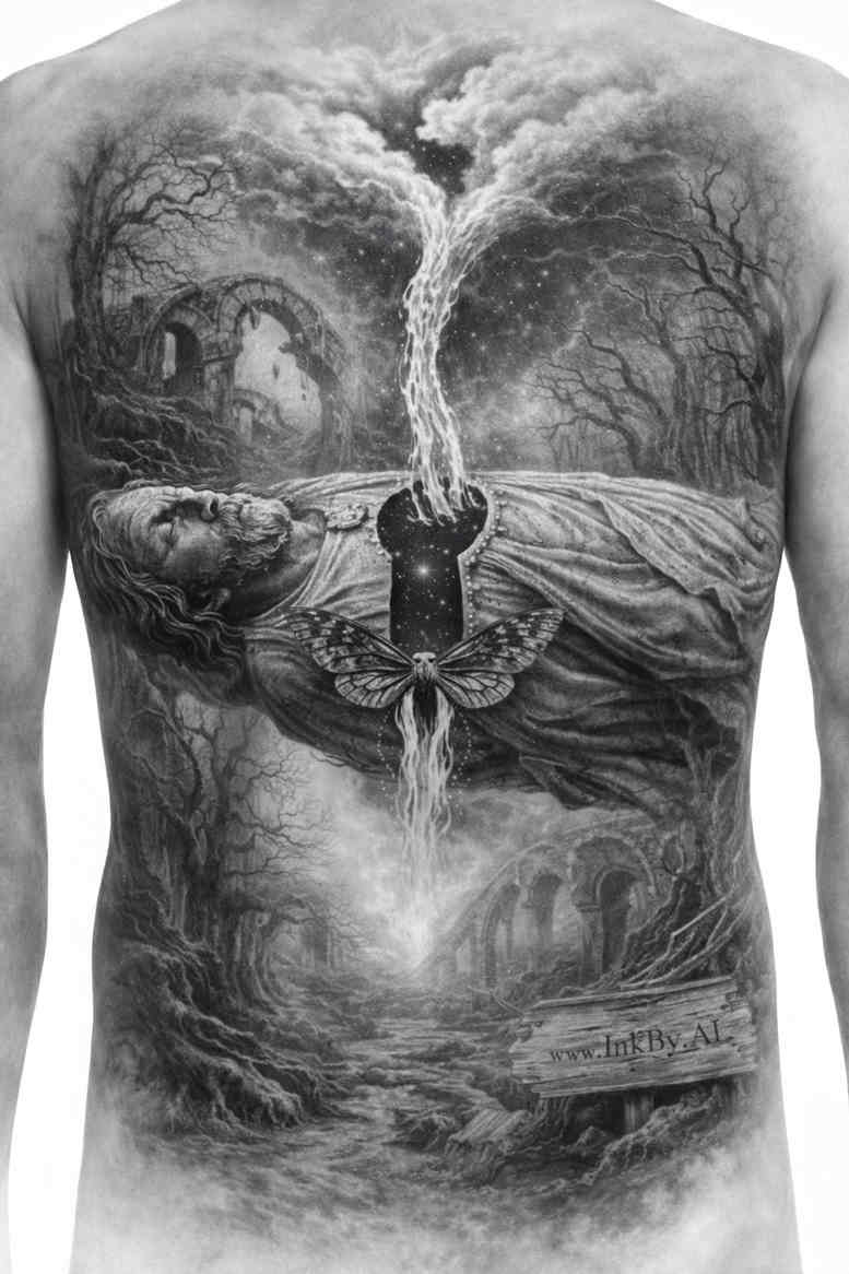 An imposing grayscale panorama occupies the chest, with a dark forest arch as the primary frame. The trees lean inward to form a natural doorway that seems to hold a quiet vigil over a single pendant dagger suspended at the central axis. The pendant acts as a talisman, its blade catching a subtle highlight, while the hilt carries a minimal decoration that anchors the composition. The surrounding woodland is treated with a mix of fine line textures for bark and broad washes for shadow, producing a tactile sense of depth that remains legible on the skin’s curvature. A veil of mist threads through the upper canopies, softening the contrast and lending a dreamlike mood that contrasts with the stark black masses at the base. The lower fields sink into deep blacks, which not only intensify drama but also contribute to cover-up potential if the wearer wishes to obscure underlying ink. The grayscale palette emphasizes form, volume, and atmosphere rather than color, inviting an interpretation anchored in themes of thresholds, protection, and memory. Compositionally, the design reads as a vertical narrative: the arch draws the eye upward toward mystery, while the pendant anchors the gaze and then guides it downward through the forest floor, suggesting an ascent and a descent within a single image. The piece balances negative space with dense shading so that details remain distinct when transferred to skin, even as the inks age and the lines soften. AI-generated as a concept, this tattoo design delivers a bold, cinematic silhouette that remains coherent from a distance and rewards close inspection. Its heavy black areas make it a natural candidate for a cover-up on larger surfaces, yet the integrated grayscale gradients preserve clarity for a lasting, enduring tattoo design. The motif borrows from archetypal gateways and guardians, with the arch serving as a threshold between realms and the pendant as a symbol of memory and protection; together they form a stoic, timeless narrative that adapts to different body contours while preserving impact.