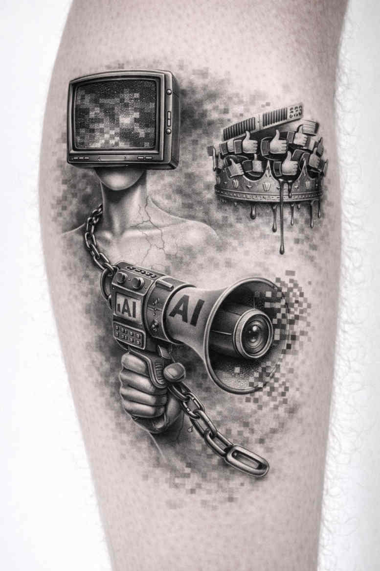 An intricate grayscale composition merges photography relics with machine anatomy in a compact vertical arrangement. A camera forms the focal point, its boxy body shaded with crisp linework and smooth gradients, while a heavy chain coils around it, implying both constraint and connection. Intertwined gears peek from behind the housing, their serrated teeth catching the light, and a strip of film winds along the limb, with frames suggesting motion and memory. The tonal range remains in black and grey, with bold blacks pushing the silhouette forward and luminous grays modeling subtle curves and reflections. The design relies on precise line weights and stippling to convey texture—the chrome-like gleam of metal, the matte finish of the camera body, and the rough grain of the film stock; negative space is employed to carve highlights, preserving legibility as ink ages. Compositionally, the elements are arranged to guide the eye along a flowing path: from the camera lens, through the chain and gears, to the film strip that anchors the piece to the skin’s contour. Symbolically, the tattoo speaks to memory, craft, and time: the camera captures moments, film preserves them, and the machinery evokes the interplay between human intention and engineered precision. This is an AI-generated concept that demonstrates how synthetic creativity can fuse narrative photographic motifs with industrial anatomy, offering a dramatic yet sophisticated option for a cover-up-friendly grayscale statement. The piece remains versatile for placement and can be expanded with additional elements if desired, maintaining a balance between shading depth and mechanical form.