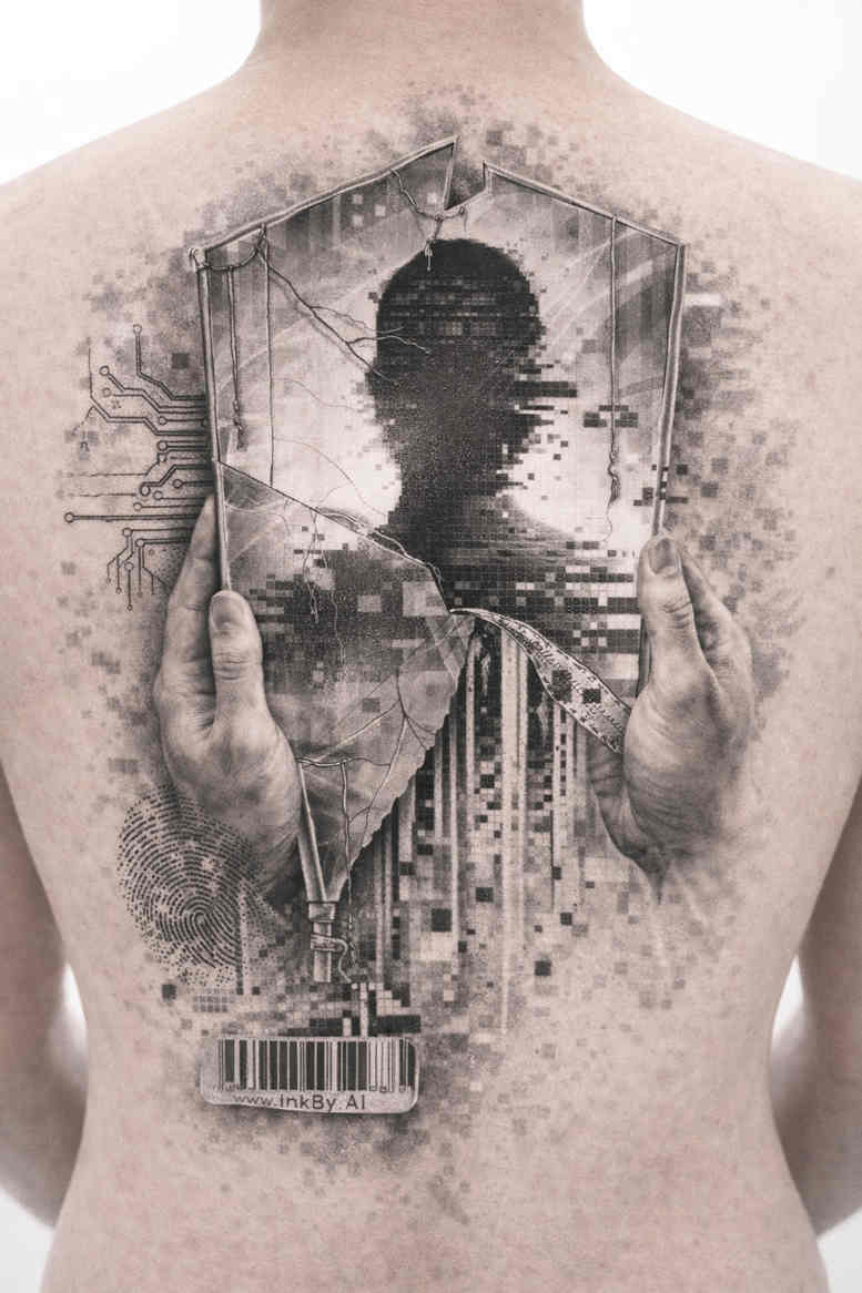 An evocative double-exposure back piece places a solitary silhouette at the center, surrounded by a lattice of branches that bleed into a distant cityscape. The grayscale palette reduces the image to a study of light and shadow, allowing negative space to sculpt form and motion across expansive skin. The silhouette acts as a portrait of memory and inner dialogue, while the intertwining branches symbolize growth, time, and the way lived experience twists through personal history. The cityscape within the torso suggests urban ambition, hidden narratives, and the idea that identity is shaped by the environments we inhabit. The technique leans into illustrative realism with delicate line work and soft feathering, combined with crisp edges that ensure clarity across broad areas. The contrast is calibrated to maintain legibility on the wearer’s back, so the composition can be appreciated from a distance and up close alike. The piece unfolds as a narrative sequence: a figure confronted by nature’s tendrils and a man-made horizon, a meditation on the tension between organism and metropolis. Since this concept was generated by an AI system, it embraces a modern edge while preserving a timeless seriousness appropriate for a large tattoo. The design’s central symmetry anchors the gaze, while the surrounding elements provide texture and atmosphere without overpowering the main subject. In terms of meaning, the work speaks to transformation, resilience, and the dialogue between private memory and external reality. The combination of silhouette, branches, and cityscape is highly adaptable to alterations such as color accents or additional motifs, and its dark tonal range makes it an excellent choice for a cover-up if desired, allowing new imagery to layer over or echo the original composition.