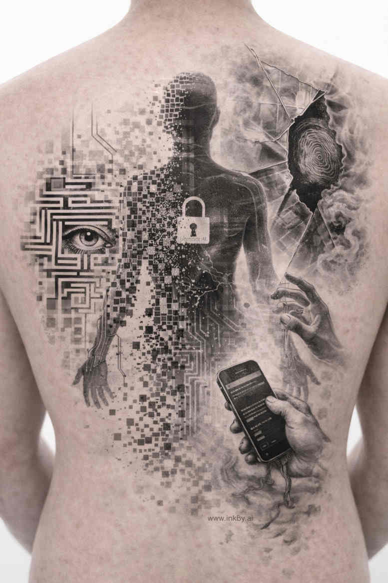 This backpiece presents a bold, high-contrast exploration of structure and mystery rendered in blackwork and black-and-grey shading. The composition runs vertically along the shoulder blades and spine, balancing expansive solid blacks with carefully carved negative spaces to create a dramatic chiaroscuro that remains legible from a distance. On the left, a precise geometric grid anchors the design, suggesting order, calculation, and the potential for narrative mapping across the wearer’s back. Center stage is a dark silhouette whose form dissolves into stippled texture and smooth gradient transitions, giving the figure a sense of weight and motion while maintaining an air of ambiguity. Bottom-right, a stylized padlock introduces a motif of memory, secrecy, or protection, its geometry reinforced by crisp edges and subtle highlights achieved through shading rather than color. The piece relies on heavy blackwork technique: solid fields of black, dense dotwork, and cross-hatching to build texture, contrast, and depth without the need for vibrant color. The overall mood is a mature, graphic statement—intense, architectural, and enigmatic. This AI-generated design concept embraces modern planning and algorithmic influence while honoring traditional tattoo craftsmanship, making it a compelling project/idea for refinement to suit individual body contours. Given its substantial darkness and dense tonal range, the design is especially suitable as a cover-up baseline, capable of integrating or concealing previous inscriptions or scars beneath the new black layers. Symbolically, the grid speaks to structure and discipline; the silhouette embodies the human element within that structure; the padlock denotes memory, secrets, or protection. The result is a cohesive backpiece with strong visual impact, ideal for a wearer seeking a statement piece that blends geometry with mystery, and adaptable for adjustments such as additional symbolic accents, altered proportions, or extended shading to harmonize with existing body art. As an AI-generated tattoo design, it also invites the wearer to engage with a contemporary concept while preserving the tactile, artisanal presence that defines high-end blackwork.
