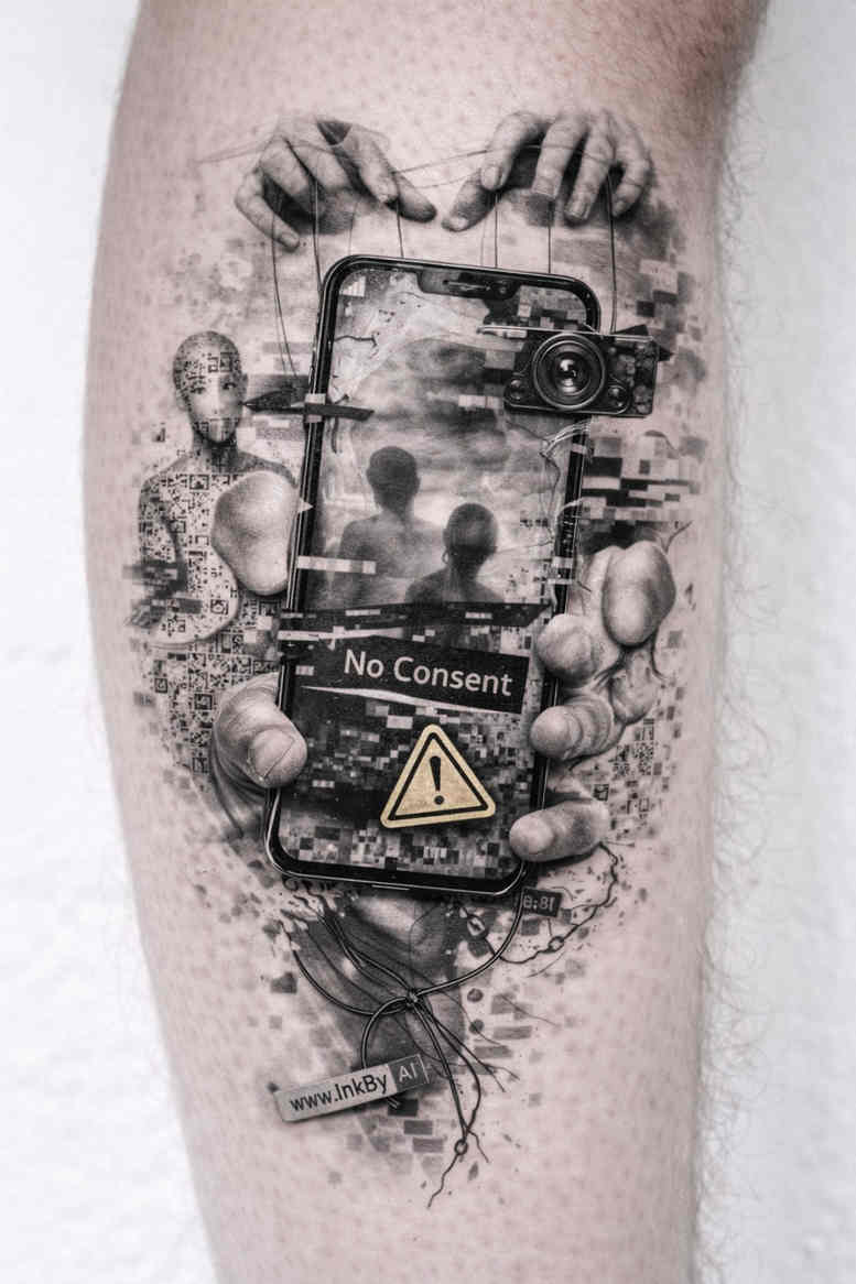 From a distance, this Blackwork tattoo design presents a compact, vertically oriented composition anchored by a bold gear wheel that dominates the field. The piece relies on solid black fills and crisp line work to carve a mechanical aura, while stippled shading and speckled texture create depth and motion around the central forms. At the core sits a stylized triangle warning sign, its clean geometry providing a counterpoint to the circular gear and suggesting themes of caution, precision, and the driven nature of industry. Surrounding elements flow outward with splatter textures, ink droplets, and soft gradient smudges that evoke energy without sacrificing legibility. The negative space around the motif is deliberately managed to maintain a strong silhouette on skin, ensuring the tattoo reads clearly on a forearm or shin. Symbolically, the gear implies cycles, motion, and human labor, while the triangle alludes to warnings and thresholds—tensions between risk and safety, function and form. The craft blends classic blackwork intensity with a modern abstract vocabulary, delivering a design that is bold, graphic, and highly adaptable. This AI-generated concept is offered as a project-ready idea that can be scaled or refined to suit placement, skin tone, and personal meaning. Given its dense black areas, it also functions well as a cover-up option, providing substantial overprint to mask existing tattoos while preserving the integrity of the new graphic. The texture work, from granular speckling to controlled gradients, ensures durability over time and a timeless, graphic presence that stays legible as ink settles. Line weights vary to emphasize the focal gear while thinning toward the outer edges, creating a sense of depth and three-dimensionality. The composition favors a center of gravity that makes it suitable for placement on forearms, calves, or ribs, with margins designed to accommodate movement and healing. For a client seeking a piece that marries industrial iconography with decorative restraint, this design offers a crisp, timeless solution. The AI origin is acknowledged in the project notes, but the tattoo stands on its own as a strong, standalone motif that communicates craft and intention.