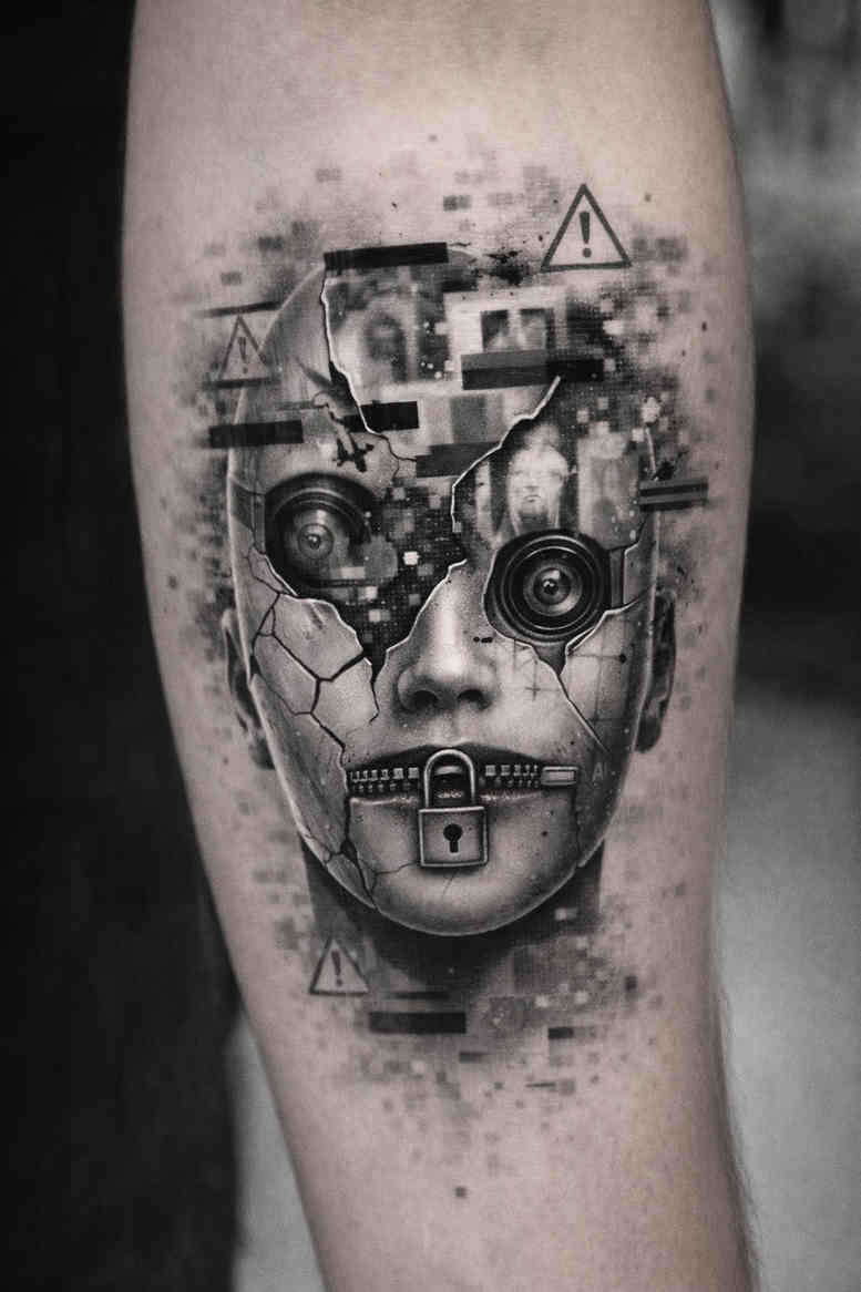 An AI-generated geometric portrait tattoo design that merges a human visage with angular geometry. The central element is a stylized face, rendered with bold black ink and delicate grayscale shading to preserve depth while maintaining the crisp clarity of linework. Above and around the head, a lattice of triangles, facets, and linear motifs forms a crown-like structure that evokes architectural masks and ceremonial symbolism. The composition plays with positive and negative space: dense black shadows anchor the cheeks and temples, while lighter zones reveal the nose, lips and brow through subtle tonal transitions. Repeating geometric shapes create a rhythmic pattern that guides the eye around the portrait, giving the piece a sculptural, almost mosaic-like quality. Symbolically, triangles denote balance, transformation, and direction; the mask-like face hints at identity, memory, and metamorphosis—an evocative narrative for a personal tattoo. The overall aesthetic sits at the intersection of geometric precision and moody grayscale realism, delivering a bold, contemporary statement suited for sleeves, back pieces, or forearms. This concept is presented here as an AI-generated design to inspire a commission and to illustrate a project idea. The monochrome palette emphasizes contrast and texture rather than color, ensuring strong legibility against the skin while allowing future color accents if desired. Given its dense composition and dramatic silhouette, it is particularly effective as a cover-up option for previous work, where crisp lines and unified grayscale can harmonize with or obscure underlying imagery. The design embraces a tactile, architectural quality, inviting customization of scale, line weight, and spacing to fit individual anatomy and personal symbolism; as a result, it remains open for refinement by a tattoo artist while preserving its core geometric language. Artists can tailor line density, adjust the number of triangles, and adapt shading and line weight to body contours, skin tone, and placement. This AI-generated origin invites further experimentation and collaboration with a tattoo artist to realize a personal story in ink. As a magazine feature, the piece demonstrates how modern geometric portraiture can fuse human emotion with architectural precision, appealing to collectors seeking dramatic grayscale work.