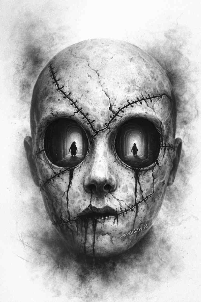 An AI-generated tattoo design concept rendered in grayscale, this piece centers on a cracked porcelain doll head that stares with hollow sockets. The head dominates the composition, its surface rendered with smooth gradients to convey skin as pale porcelain split by a lattice of cracks. Deep eye sockets swallow light and give the gaze an unnerving stillness, while the mouth and jaw dissolve into shadow, enhancing the eerie, surreal mood. The technique leans into black and grey realism: fine line work to define fractures, soft shading to model planes, and subtle stippling at the edges to merge the form with negative space. The cracks trace an irregular lattice that could guide linework around the cheekbone, jaw, and crown, creating a restrained geometric rhythm. The overall tone fuses elements of horror and melancholy beauty, inviting contemplation of fragility, memory, and decay. The design reads as a single character study that could function as a bold centerpiece on the shoulder or chest, with the cracks providing structure and flow across the surface. As a concept, it blends tangible portrait quality with dreamlike distortion, making it suitable for a modern, fashion-forward tattoo while remaining timeless in grayscale. The image is AI-generated, offering an ambitious template for a tattoo design that emphasizes texture, light, and contrast. Depending on placement, scale and shading, it could also serve as a dramatic cover-up piece, though its strong contrast and stark forms call for careful execution to preserve the porcelain feel.
