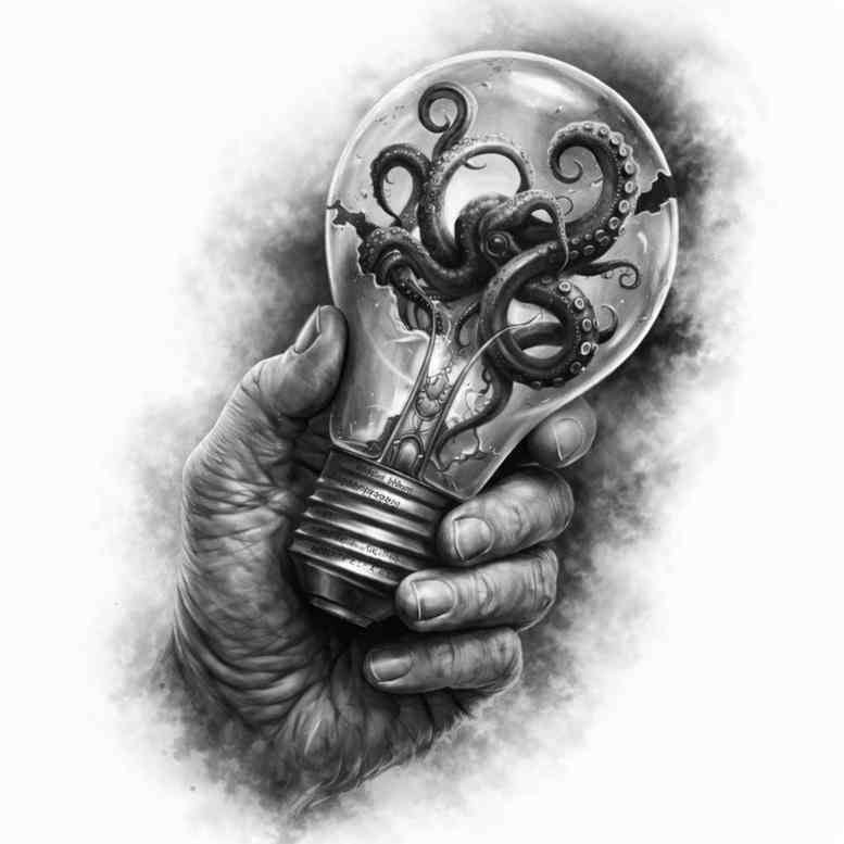 An audacious fusion of anatomy and whimsy, this design places a living octopus within a glass bulb that is forcefully gripped by a shaded hand. Rendered in black and grey with meticulous hatching and smooth gradients, the composition balances the tactile weight of the hand against the fragile geometry of the bulb, creating a tension between strength and fragility. The octopus emerges from the bulb as if liberated from inside the mind, its tentacles curling in dynamic relief around the glass and around the knuckles, guiding the eye through the frame. The chiaroscuro work emphasizes depth inside the bulb’s reflective interior and the wet texture of the octopus skin, while generous negative space around the central motif ensures legibility at a range of scales. The concept leans into surrealism by marrying an ordinary domestic object with a marine predator, inviting viewers to interpret themes of intelligence, adaptability, and the hidden currents of thought that travel beneath the surface. The piece functions as a conceptual study and a ready-to-tattoo project, suitable for placement on forearm or upper arm, and its monochrome palette guarantees crisp line-work and long-term readability. The design explores how light refracts through glass and how the mind mirrors the sea’s uncertainties, using the octopus’s iconic limbs as looping motifs that guide the gaze through the composition. This AI-generated concept embodies an imaginative approach to tattoo design, offering a striking focal point that remains legible at various scales and can be integrated with other motifs or stand alone as a statement piece.