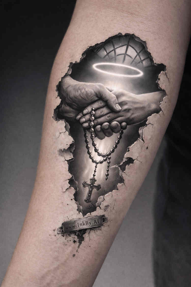 An AI-generated tattoo concept rendered in blackwork, this design presents a dramatic torn-skin illusion where jagged edges peel back to expose a smooth circular emblem beneath. The composition places a stark circle at the center, framed by irregular negative space and dense shadows that bleed outward, creating a commanding focal point while implying motion as if the skin is splitting apart. The outer rind of torn tissue forms a bold frame, guiding the eye toward the circular symbol, which can symbolize unity, eternity, or cyclical patterns depending on the wearer’s narrative. Within the circle, subtle highlights suggest a metallic or glassy texture, inviting close inspection and lending a tactile, almost sculptural quality to the piece. The overall mood is fearless and enigmatic, making it a statement tattoo that can grow with the wearer’s story. This AI-generated concept embraces the modern blackwork ethos—clean, high-contrast lines, seamless transitions, and a strong emphasis on form over ornament. The torn-skin motif hints at rebirth or hidden meanings beneath the surface, while the circle acts as a portal or compass, echoing themes of time, fate, and personal growth. Negative space is leveraged to keep the design legible with aging and movement, ensuring the circle remains the anchor whether ink is bold or subtle. Given its substantial black areas, the design is particularly well-suited as a cover-up, enabling older ink to merge with or be replaced while preserving silhouette integrity. This piece is AI-generated and intended as a flexible base for customization by tattoo artists, suitable for forearms, calves, or shoulders. The concept translates well into a crisp, graphic piece with room for texture in the circle’s edge and optional stippling outside the tear for added contrast, while the bold black blocks support masking of previous work and preserve a timeless, contemporary edge.