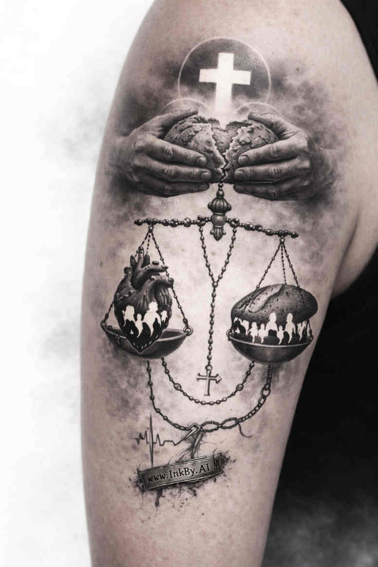 AI-generated concept, this black and grey illustration centers on a scale of justice anchored by a cross at the apex. The composition runs along a single vertical axis: at the crown a simple cross, beneath it two hands grasping the ends of a slender beam, from which a delicate chain descends to suspend two pans. In this restrained grayscale palette the forms are built from fine line work and smooth tonal shifts, yielding a dramatic yet legible image suitable for a large area tattoo. The left and right pans carry symbolic motifs rather than explicit imagery, allowing the piece to read as a meditation on balance, duty, and consequence. The cross introduces a spiritual dimension, suggesting faith as a guiding principle, while the scales speak to judgment, responsibility, and the weighing of choices in life. The shading emphasizes contrast and texture: skin-like gradients on the hands, crisp lines for the chain links, and soft shading on the pans to convey volume and weight. The overall composition favors clarity and timeless appeal, with a strong silhouette that can adapt to forearm, calf, or back placements. Because the design is AI-generated, it benefits from precise symmetry and a cohesive visual language, though it remains fully adaptable by the tattooist to match individual anatomy and preferences. The motif’s universality means it can function as a standalone emblem or be integrated with additional personal symbols. This concept also presents opportunities for customization, such as adjusting the size of the pans, modifying the chain detail, or introducing subtle texture on the cross to reflect different meanings. In sum, the piece offers a refined, symbolic study of balance and belief, crafted in grayscale for a classic, enduring tattoo aesthetic. AI-generated concept, suitable for cover-up considerations if desired, and designed to retain legibility on aging skin.