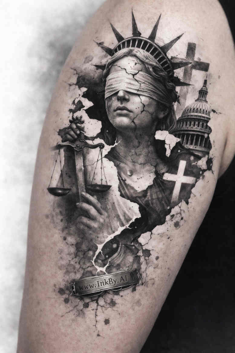 This tattoo design renders in black and grey realism, presenting a classical bust at the foreground with a radiant sunburst halo blooming behind the head. The composition merges Renaissance sculpture cues with subtle urban silhouettes, as a muted cityscape traces the lower contours and a delicate bird glides above the shoulder. The shading employs smooth gradients, fine line work, and scattered ink splatters to create a moody, tactile texture that reads as a sculpture carved into skin. Contrast is achieved through deep blacks against midtones and soft grays, allowing the piece to hold graphic punch while preserving subtle atmospheric nuance. Symbolically, the bust embodies timeless beauty and intellect, the sunburst representing enlightenment or divine radiance, and the cityscape hinting at memory, place, and modern aspiration. The design operates like a framed panel within the canvas of the forearm, with the central figure anchoring the eye while the surrounding elements provide context and narrative cadence. As an AI-generated concept, the image demonstrates how algorithmic imagination can translate into tattoo-ready linework and grayscale shading that a tattoo artist can adapt to anatomy and skin tone. Given the density of black areas and the controlled negative space, this piece is particularly well-suited for a cover-up, as solid black regions can mask older ink or uneven skin tone while the sweeping grayscale transitions maintain legibility and refinement. The resulting artwork invites contemplation: a fusion of classical iconography with contemporary urban resonance, offering a versatile yet striking motif for someone seeking a bold, enduring statement. The layout prioritizes vertical balance, ensuring the sunburst radiates outward while the cityscape anchors the base, enabling a natural flow across the limb. The choice of grayscale ensures compatibility with future color overlays if desired.