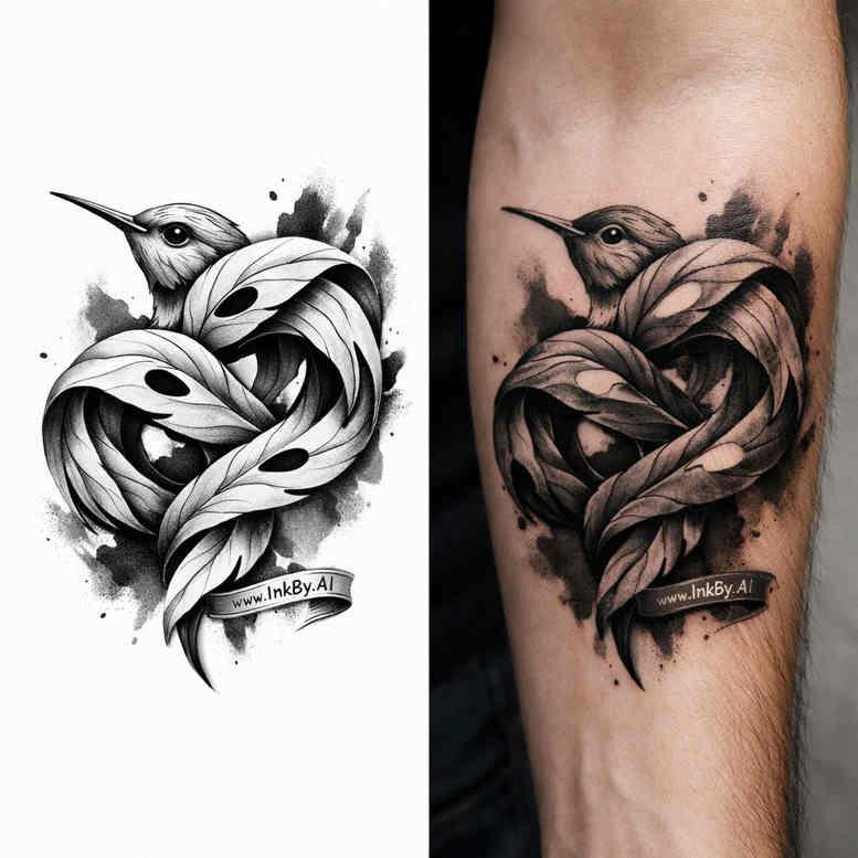 This AI-generated tattoo design presents two koi fish twined around a sinuous ribbon in black and grey realism, creating a kinetic centerpiece for the forearm. The composition relies on a bold, clean outline for the fish forms, with dense black ink anchoring the edges and light gray washes modelling the bodies, fins, and rippling water around them. The ribbon acts as a continuous carrier, weaving through the fish and forming a graceful loop that guides the viewer’s gaze from the head of one fish to the tail of the other, while leaving intentional negative space to preserve clarity as the piece ages. Realistic shading is achieved through layered gradients and selective stippling, giving the koi’s scales a suggested texture without over-detailing, which keeps the design legible at different sizes. The symbolism blends traditional Japanese koi imagery with a contemporary ribbon motif: perseverance, transformation, and the idea of fate or continuity. The stark monochrome palette reinforces a timeless, versatile aesthetic, allowing the wearer to adapt the piece to different skin tones and to pair it with other elements if desired. The overall balance of positive forms (the koi and ribbon) and negative space creates a dynamic silhouette that reads well from multiple angles, whether viewed in motion or at rest. This tattoo design exemplifies how black and grey realism can convey movement and narrative without color, relying on contrast, edge definition, and tonal variation. It’s a study in form and rhythm, where each line and shade contributes to a cohesive whole while remaining crisp on the skin over time. Note that this design is AI-generated.