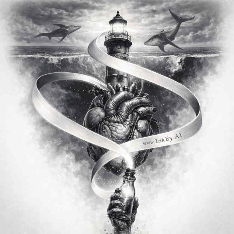 An arresting black-and-grey concept fusing maritime imagery with a dreamlike infinity motif, this tattoo design places a solitary lighthouse high atop a windswept promontory as the anchor of the composition. A sinuous serpent coils upward from the base, its scales rendered with careful cross-hatching and subtle tonal shifts that create texture against the flat, nocturnal sky. A flowing ribbon spirals around the beacon in an elegant S-shape, carrying faint script along its length and inviting closer inspection to reveal a personal message or motto. The birds in flight punctuate the upper plane, their silhouettes providing negative space that balances the heavy form of the lighthouse and the serpentine line. The overall effect relies on pronounced contrast and restrained gradient work to push the main elements forward while allowing the background to dissolve into a soft mist, a hallmark of black-and-grey realism with surreal undertones. The composition emphasizes vertical rhythm—the lighthouse as a steadfast guide, the ribbon as an unending loop, and the snake as a symbol of metamorphosis and resilience—while the looping ribbon suggests time without beginning or end. While clearly narrative, the piece is designed as a concept tattoo that an artist could translate into a refined finish, with line work that preserves the ribbon’s curvature and the beacon’s crisp silhouette. This AI-generated concept offers substantial potential for a cover-up or standalone statement piece, because the dense negative space can mask prior markings while preserving the scene’s mood and mythic resonance. The imagery invites contemplation of fate, navigation, and transformation, with the surreal coordination of land, creature, and symbol functioning as a compact visual allegory.