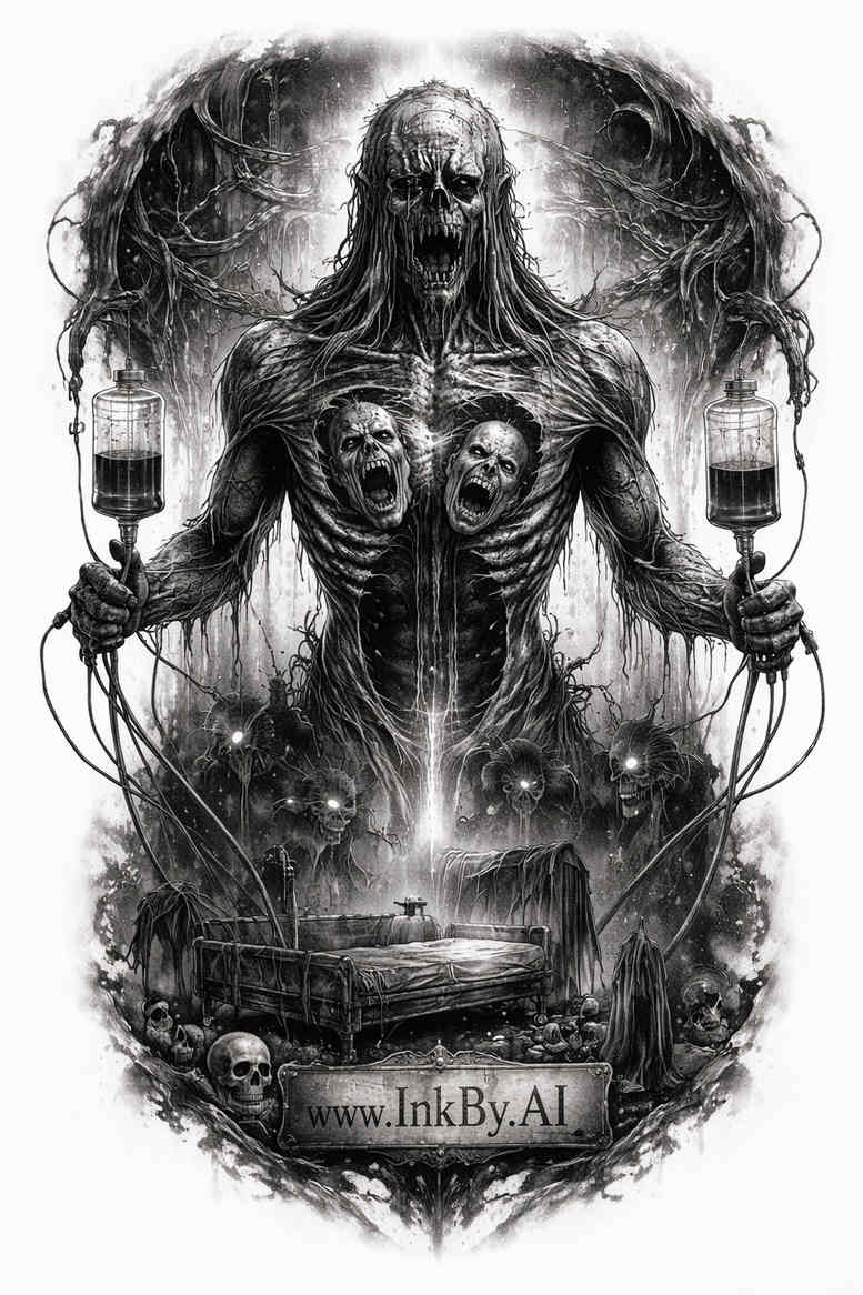 An imposing, blackwork-driven tattoo concept centers on a demoness or dark goddess figure carved in high-contrast black ink. The composition is vertically oriented, with a towering humanoid silhouette at the center, shoulders broad, chest detailed with rib-like shading that reads as armor of bone and shadow. A horned headdress crowns the figure, its arches echoing totems or ritual crowns found in mythic iconography. The form emerges from a cloud of smoke and shadow that spirals outward, creating negative space around the edges and guiding the eye toward the face and torso. Dense areas of black ink establish a sense of weight while carefully placed highlights and subtle stippling provide texture and depth, giving the piece a tactile, almost sculptural quality. A banner at the base anchors the composition as if inscribed on a pedestal, imparting a ceremonial, archaic feel that nods to ancient tattoo traditions. The overall mood blends power and mystique, allowing the demoness to symbolize inner strength, rebirth through shadow, or guardianship over thresholds between realms. The AI-generated concept leverages classic blackwork vocabulary—solid fields of ink, crisp linework, and smooth gradients—to ensure legibility and long-term durability on skin. This design also considers cover-up potential: the solid blacks can obscure previous marks, while the central figure provides a bold focal point that can be augmented with lighter shading or selective color accents if desired. Because the image is AI-generated, it embodies a contemporary approach to composition, exploring symmetry, cinematic lighting, and iconic motifs that fuse mythic resonance with modern tattoo language. In practical terms, a tattoo artist would translate this concept into a scalable, durable piece by planning negative space to preserve movement, selecting appropriate skin type, and calibrating ink densities to maintain dramatic contrast over time. Overall, the concept presents a grand, expressive entry point for a cover-up or standalone statement piece that merges myth, mystique, and rigorous technique into a single powerful tattoo design.