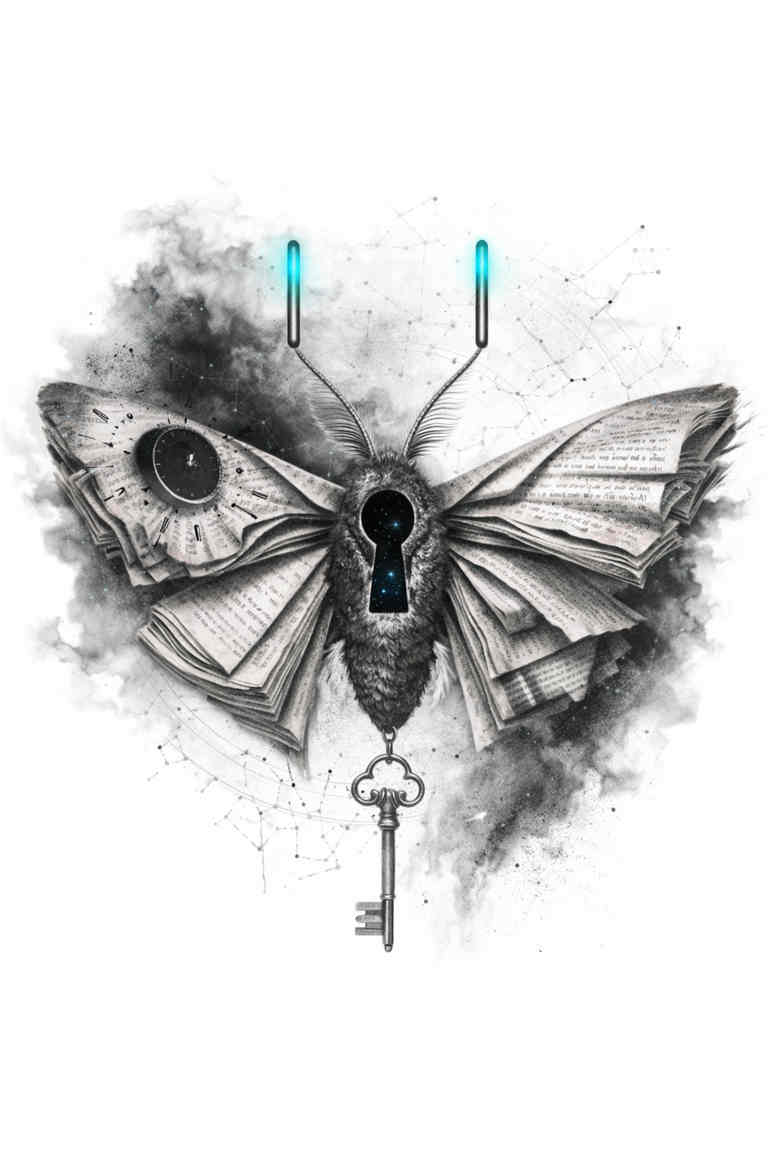Geometric Moth and Key is an AI-generated concept that threads precision linework with natural subject matter. The tattoo design presents a moth rendered in a lattice of triangles, diamonds, and facets that break the insect into a study of geometry. The wings are composed of negative space and crisp contour lines, with subtle shading that suggests depth without sacrificing graphic clarity. A slender key is suspended beneath the thorax, acting as a symbolic talisman that invites interpretation: unlocking memory, mystery, or forbidden knowledge. The composition balances symmetry and asymmetry, centering the moth while the key forms a vertical anchor that guides the eye from apex to base. The black and grey palette emphasizes contrast and legibility against the skin, allowing the design to age well as a timeless, versatile tattoo design. The motif blends geometric and natural elements to evoke a fusion of science and folklore. The moth symbol often signals transformation, resilience, and the cycles of life, while the key adds a narrative layer—a promise of access or revelation. Technical aspects include clean line weight, crisp edges, and smooth shading to preserve fidelity on the client’s skin, with careful consideration of how the design scales from forearm to back. The composition maintains readability at smaller sizes by reducing interior clutter, while the wings provide a striking silhouette when viewed from a distance. As a concept, it leverages AI-assisted ideation to fuse graphic geometry with an organic insect form, producing a modern tattoo idea that remains legible, scalable, and adaptable to various placements. The resulting artwork communicates a quiet, contemplative mood suitable for someone who values precise lines, symbolic storytelling, and a contemporary aesthetic that nods to traditional craft without imititing it.