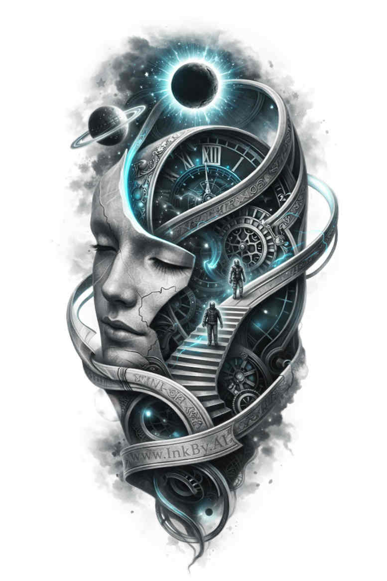 This is a bold biomechanical tattoo concept rendered in black and grey with restrained blue accents to accentuate key mechanical components. The composition centers on a stylized female head, carved with a synthesis of flesh and machine. The face remains the focal element, while interlocking gears, pistons, conduits, and tubing weave through the skull and along the neck, creating a dynamic stream of industrial forms that echo the natural contours of the visage. The gear motifs vary in size and pitch, establishing a layered plane of depth as carefully shaded gradients give volume to metal and bone alike. The eye serves as a piercing focal point, drawing attention to the human emotion embedded within the cyborg aesthetic while a brain-like structure and subtle circuitry hints at hidden intellect and data flow beneath the surface. The overall linework blends crisp, precise geometry with softer shading to balance legibility and intricacy, ensuring the design reads clearly at different scales. Symbolically, the piece explores themes of identity, transformation, and the fusion of humanity with technology, conveying resilience and curiosity in the face of rapid change. The design leverages dense areas of black to create a dramatic silhouette, which also makes it an excellent option for cover-up applications, as the heavy shading can mask underlying tattoos or skin imperfections. This concept is AI-generated, offering a sophisticated starting point that can be adapted to larger canvases or sleeves, with flexible placement along the shoulder, chest, or forearm. The result is a magazine-worthy reference that marries biomechanical anatomy with expressive portraiture, inviting personal interpretation while providing a strong visual impact across skin tones due to its contrast and dimensionality.