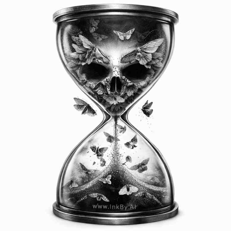 An arresting study in blackwork that centers a suspended hourglass as a memento mori motif, weaving iconography of skulls, wings, and scattered sand into a dense, symmetrical composition. The upper and lower bulbs cradle skeletal faces, their dark shading framed by delicate line work that defines each feather and contour of the winged forms. The sand, etched with stippled texture and negative space, seems to slip between chambers, creating a dynamic flow that guides the eye from apex to base. The hourglass itself is treated as an architectural device, its glass rendered with translucent gradients while the surrounding inky black fills push the imagery into a cinematic silhouette. This piece leans into blackwork traditions with stark contrasts, crisp outlines, and meticulous shading that yields a dramatic, timeless look. The symbolism is classic: time running out, mortality, and the persistence of memory, while the wings add a sense of ascent and transcendence. The composition is deliberately balanced, with the central axis anchored by the hourglass spine and mirrored skulls evoking reflection and duality. As an AI-generated concept, this design translates well to a large canvas, allowing for high-resolution linework and bold shading that remains legible on skin. For a tattoo project, it works as a standalone piece or as part of a larger narrative sleeve where the winged timekeeper can interact with other elements such as roses, clocks, or keys. This kind of motif also presents ideal cover-up potential for clients seeking to replace darker existing work, given its dense black volumes and capacity to morph into new shapes while preserving a strong silhouette. The technique emphasizes contrast between the nocturnal blacks and lighter tones, with cross-hatching and stippling adding texture to bone and fabric; the tension between organic wing forms and the rigid geometry of the hourglass keeps the viewer engaged, while the overall composition remains readable from a distance, making it a compelling statement piece for the wearer.