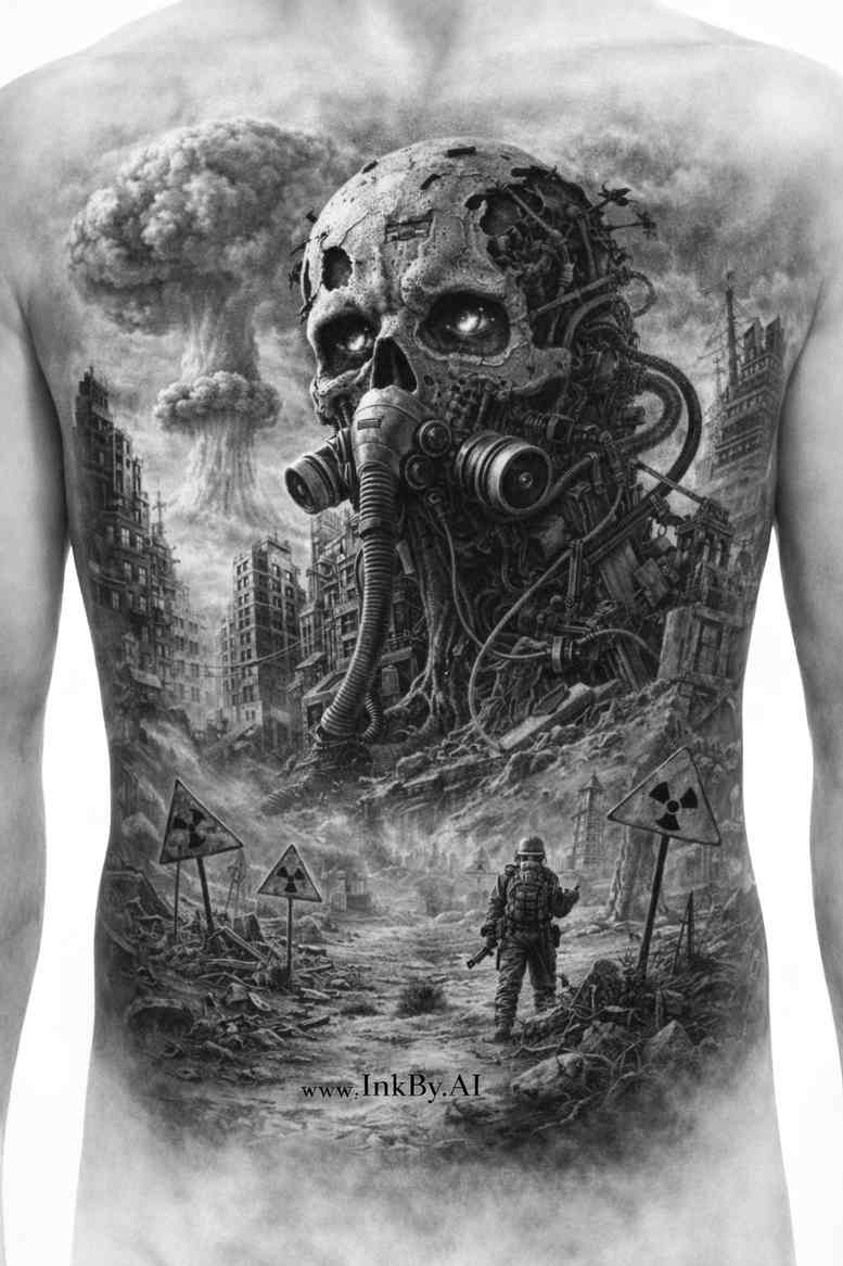 This black and grey realism tattoo design concept presents a colossal, otherworldly entity rising from a storm-tossed shoreline, dwarfed by ruins and a lone human figure in the foreground. Executed in a meticulous grayscale palette, the central creature fuses brutal anatomy with Lovecraftian elements: a gas-mask style head, mantle-like carapace, and sinuous tentacles that coil around jagged rocks and creeping across the background. The human silhouette stands as a wary observer, arms slightly raised, establishing a stark scale contrast that amplifies the sense of insignificance before a cosmic threat. The surrounding ruins and broken architecture hint at once-great civilizations now smothered by darkness, while the sea and horizon blur into a smoky gradient that pushes depth away from the viewer. The artist leverages chiaroscuro to sculpt volume, using deep blacks to anchor the creature and lighter greys for delicate textures on the tentacles, mask, and weathered stone. Subtle texturing—stippling for grain, cross-hatching for muscle, and feathered edges for mist—creates a tactile surface that reads well at large scales on skin. The composition guides the eye along a diagonal axis from the foreground figure toward the looming entity, then into the receding wreckage, yielding a narrative arc of confrontation and awe. This concept embraces monochrome realism while retaining dramatic contrast and cinematic mood, making it highly suitable as a dramatic back piece or a powerful cover-up when larger areas of black are required. As an AI-generated concept, it reflects contemporary approaches to form and silhouette in tattoo design, while inviting customization of line weight, contrast, and scale to match individual anatomy and storytelling goals.