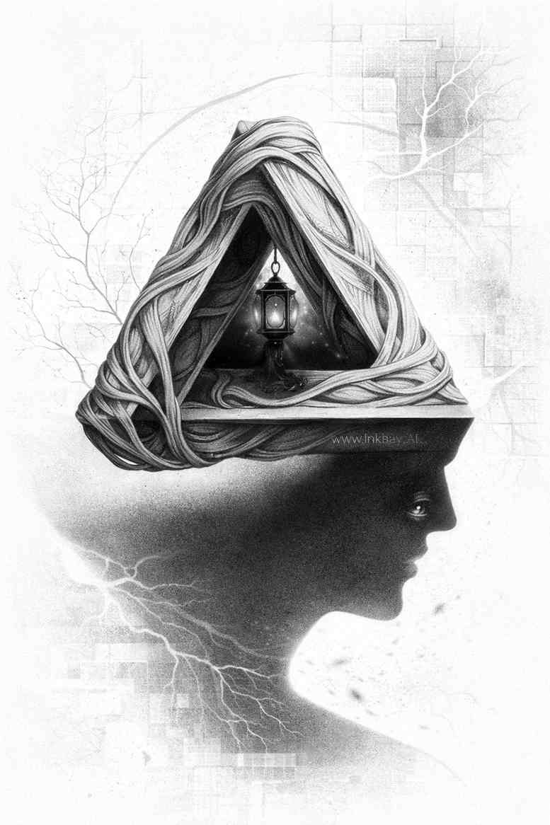 An arresting study in restrained contrast, this geometric hooded lantern tattoo design places a quiet silhouette of a head in profile beneath a draped hood, enclosed within a crisp triangle that leans toward three-dimensionality. The lantern glows as a singular light source, its soft illumination spilling across the inner face of the triangle and casting pale shadows on the hood and neck, while the outer edges dissolve into fine line textures and featherweight shading. The composition relies on negative space to create the impression of air and contemplation, with the triangle acting as a geometric cradle that frames the figure, suggesting themes of protection, inner ascent, and the search for truth in darkness. The choice of black and grey tonality preserves the solemn mood and ensures legibility on skin, while subtle cross-hatching and stippling add depth without breaking the silhouette’s clarity. The design’s symbolism can be read as a meditation on guidance—light within shadow, awareness within restraint—where the lantern is a beacon for memory, decisions, or spiritual direction. The hooded figure feels timeless, echoing archetypes of wisdom and vigilance found in various mythologies and religions, yet rendered in a contemporary, abstract register that appeals to fans of minimalism and geometry. As an AI-generated concept, this tattoo design demonstrates how modern algorithms can synthesize classic motifs—hood, triangle frame, and lantern—into a compact, legible form suitable for a shoulder, forearm, or upper arm canvas. The piece invites a patient tattooist to translate airy grayscale gradients into skin tones, preserving the crisp edges of the triangle while letting the lantern’s glow morph with natural lighting. Overall, the image balances restraint and symbolism, offering a versatile motif for personal storytelling that remains legible at various sizes and skin tones.
