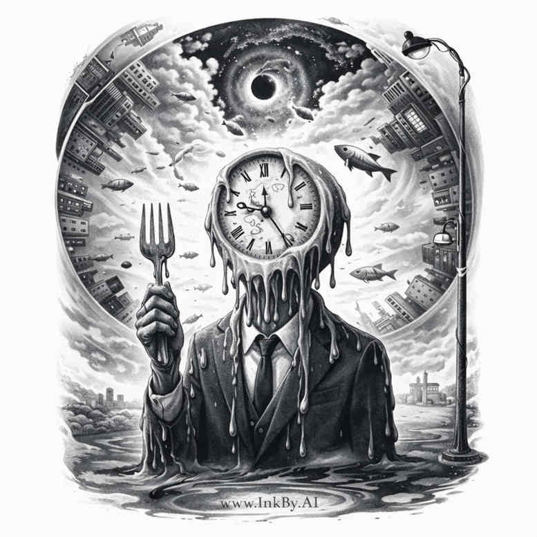 An arresting black-and-grey surrealism tattoo concept depicts a man in a tailored suit with a clock replacing his head, a visual meditation on time, identity, and the mechanized feast of modern life. The composition centers a sharply dressed figure whose head is literally a clock face, the hands replaced by fork-like appendages that hint at appetite and ritual. The monochrome palette emphasizes texture and linework over color, with dense blacks providing weight against pristine whites, and fine crosshatching creating subtle gradations in shadow. The figure sits or stands in a quiet, almost theatrical pose, allowing negative space to breathe around the silhouette and to foreground the clock’s face, where roman numerals and mechanical gears suggest a hidden complexity beneath the surface persona. The surrounding area avoids elaborate background details to keep focus on the central motif, allowing the brain to fill in the implied narrative: time as a mask, the hunger of routine, and the cost of conformity. The design draws on surrealist currents, with crisp linework that reads well in both small and large formats, making it highly adaptable for a tattoo sleeve or a standalone piece. The concept benefits from its AI-generated origin, offering a fresh approach to a classic motif through algorithmic interpretation and stylized anatomy. Because of the strong negative space and heavy black values, this piece is also a strong candidate for cover-up applications where larger blocks of dark shading can elegantly conceal previous work while integrating the new-time motif. This piece deliberately toys with symbolism—time, appetite, and identity—so that viewers at any distance experience a clear silhouette with a memorable cognitive beat, and the machine-informed line fidelity lends itself to crisp tattoo transfer and long-term readability.