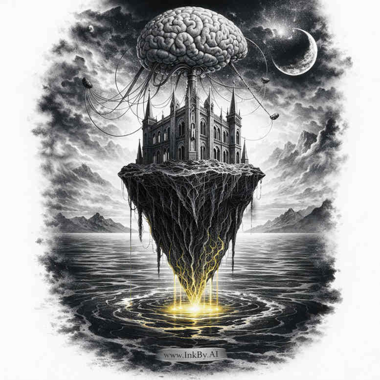 This AI-generated Surrealism tattoo concept presents a riveting tableau: a solitary Gothic cathedral perched upon a jagged floating island, suspended in a moody, ink-saturated sky. The composition relies on a central architectural form, with intricate flying buttresses and pointed arches rendered in refined linework, while the island itself recedes into a smoky grayscale texture that suggests weight and gradient through black and grey shading. A luminous pedestal at the island’s base casts a suggestive gold glow, which in print translates to a punch of warmth that anchors the otherwise monochrome field; above the island, a suspended orb-like sphere adds a dreamlike, otherworldly element that reinforces the surreal mood. The sky is built from layers of soft cloud forms and negative space, allowing the cathedral to breathe as a solitary monument within an imagined landscape. The overall balance is a careful interplay between heavy blacks and delicate midtones, with cross-hatching and stippling used to create texture on stone, moss, and rock. The symbolism of a cathedral on an isolated floating island can evoke themes of endurance, ascent, and spiritual ascent beyond the ordinary world, while the orb could reference celestial guidance or a mind-space beyond physical limits. Practically, this concept is ideal for tattooing as a cover-up due to its substantial black mass surrounding the central subject, its ability to incorporate existing blemishes into the dark areas, and its strong, high-contrast silhouettes that maintain legibility on the skin. As an AI-generated concept, the design demonstrates how modern algorithms can translate architectural grandeur into wearable art, while preserving a timeless sense of mystery. The piece is intended as a project or idea, inviting a tattoo artist to reinterpret the floating island cathedral with personal line weight choices and detail density, and to tailor the glow and orb to a client’s skin tone and placement. The treatment plan for tattoo artists includes suggestions for line density and shading: heavy outlines around the cathedral; soft bevels for the island; dotwork around edges; the concept leaves space for color accents if desired. This reinforces its adaptability as a cover-up piece while maintaining dramatic impact across sizes.