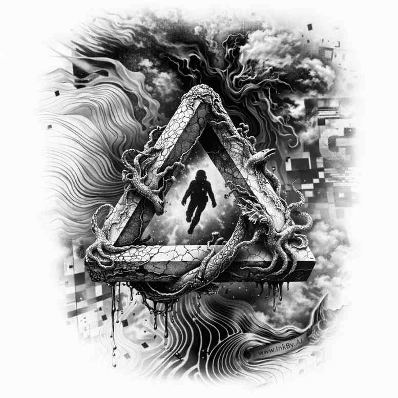 Geometric tattoo design rendered in black and grey, the central element is a triangular prism that seems to float in an abstract sea of lines and splatters. The triangle acts as a frame, within which a solitary silhouette is embedded, creating a stark focal point. The surrounding negative space and fine line work create a sense of depth, tension, and movement, blending hard geometry with fluid ink textures. The composition plays with contrast: densely inked motifs at the edges fade into white space, guiding the viewer’s eye toward the interior figure. This AI-generated concept embraces motifs of balance, transformation, and mystery, making it suitable for placements such as the forearm, calf, or back where a bold yet restrained design can be integrated with existing work. The geometric style relies on precise angles and clean lines, while the splatter and weave of shading give a tactile sense of texture. The triangle can symbolize stability or the triadic nature of existence, and the silhouette invites interpretation—perhaps a traveler, a dreamer, or a memory seeking form. For a cover-up scenario, the dense black areas can be used to mask previous tattoos, and the overall negative space allows for a customizable extension if needed. The piece leans toward a modern, editorial vibe, ideal for clients who appreciate contemporary tattoo design that reads as both art and statement. As an AI-generated concept, this design demonstrates how algorithmic creativity can translate into tattoo-ready visuals, blending geometry with narrative softly enough to be tailored to personal stories. Additionally, the piece balances negative space and dense ink to offer flexibility for future expansions around elbows or shoulders, enabling a cohesive sleeve if desired.