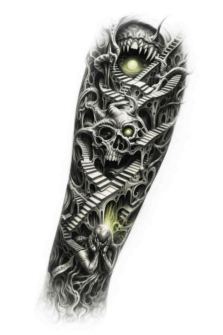 An AI-generated concept for a forearm sleeve, this biomechanical design fuses anatomy with machine elements in a dramatic, high-contrast composition. The central motif is a skull rendered with interlocking gears, pistons, and tubing, so the bone and metal appear to merge into a single engine. Crisp, angular lines define the skull contours while curved mechanical sections create a sense of motion around the limb. Deep black shadows carve volume across the forearm and push the metallic textures forward, with lighter grays suggesting steel sheen and worn surfaces. Negative space is used strategically to form eye sockets and jawlines that breathe and raggedly separate components, allowing the viewer to follow a continuous path from elbow to wrist along a lattice of cables and gear rims. Texture is achieved through a mix of solid fills, fine line details, and careful stippling to simulate rivets, mesh, and worn metal. The overall effect sits firmly in the biomechanical and blackwork traditions, offering a narrative of strength, resilience, and the union of flesh and mechanism. The design lends itself to a sleeve wrap, so lines flow with contours of the arm, and the repeating circular motifs create a rhythmic pattern that keeps the gaze moving. The concept purposely relies on black ink with careful gradations to preserve legibility over time, making it suitable for long-term wear. As an AI-generated concept, it demonstrates how modern tattoo design can explore fusion themes while remaining cohesive when inked as a forearm piece. Because of its substantial black areas, this piece is presented as a ready-made option for cover-up applications, should the wearer seek to mask older ink with a bold, industrial aesthetic.