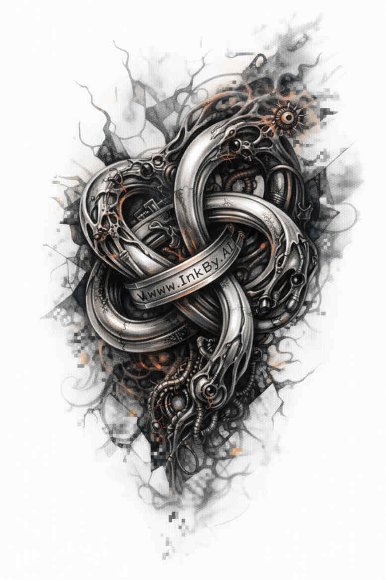 An AI-generated, black-and-gray tattoo design featuring an intricate interwoven knot that rises from a dense core into wispy strands. The composition balances bold negative space with finely drawn loops that cross and weave in a timeless braid, creating a geometric yet organic silhouette. The central knot acts as a focal point, while surrounding shading adds depth and a sense of motion, reminiscent of ornamental metalwork, filigree, or baroque engravings. Each strand is rendered with careful line work and gradient transitions to achieve a metallic, steel-like sheen, enhancing the three-dimensional illusion. The interlacing pattern expands outward with subtle variations in curve and tension, producing a rhythm that invites the eye to follow its pathways around the design. The motif carries classic knot symbolism—connection, continuity, and resilience—while staying contemporary through its clean edges and high-contrast grayscale. The piece functions as a concept sketch suitable for AI-assisted exploration of texture, light, and structure, and it remains easily adaptable to different body areas, from forearm sleeves to back panels. Its bold contrast ensures strong readability at large sizes, while the fine line details retain clarity on close inspection. The design pays homage to geometric ornamentation and is capable of being refined by tattoo artists to suit individual aesthetics, skin tone, and needle configuration. Offered as a project/idea, this work invites feedback and iterative development, emphasizing symmetry, balance, and a timeless, versatile visual language. Note: this is AI-generated content meant to illustrate potential directions for a tattoo piece rather than a finished artwork.
