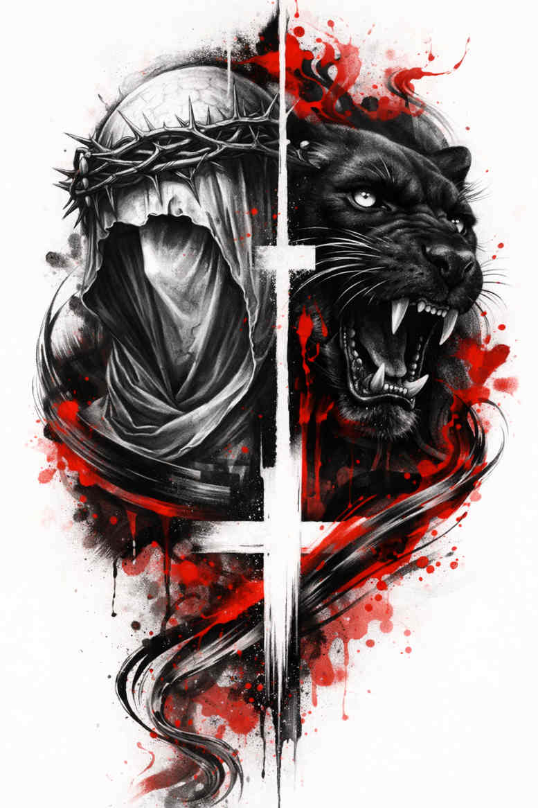 AI-generated tattoo concept presents a fearless blackwork composition pairing a hooded skull on the left with a snarling wolf on the right, divided by a stark central cross that runs vertically and intersects the design’s midpoint. The piece is rendered in black and grey with restrained flashes of crimson to energize the negative space and guide the eye along sweeping lines. On the left, dense cross-hatching and smooth gradient shading model the skull beneath a flowing hood, creating a ghostly visage that dissolves into smoke like tendrils as it approaches the cross. On the right, the wolf is defined by bold blocks of black, tight fur detailing, and a ferocious muzzle whose teeth emerge from the dark mass with high-contrast highlight, giving a sense of motion and immediacy. The white cross acts as a symbolic boundary between mortality and predatory instinct, a visual metaphor for balance, transformation, and the idea of dual forces coexisting within a single body. The composition employs a symmetrical framework while exploiting asymmetrical textures soft grays against bristling ink to create dynamic tension that remains legible at large scales. The red accents are sparing but potent, echoing life-blood or battle energy without overpowering the grayscale core. This design sits firmly in the Blackwork realm, prioritizing solid blacks, negative space, and crisp edges that translate well to skin over time. As a project concept, it invites personalization: adjust scale, modify line weight, add inscriptions along the crossbar, or replace the wolf with another guardian beast if desired. Because this is an AI-generated concept, it offers a flexible starting point for tattooists and clients alike, demonstrating how digital creativity can be transformed into a tangible ink piece while preserving the dramatic silhouette. The heavy black areas also make this piece highly suitable for a cover-up, presenting a robust canvas that can efficiently mask older work and rebuild a fresh narrative around the central motif.
