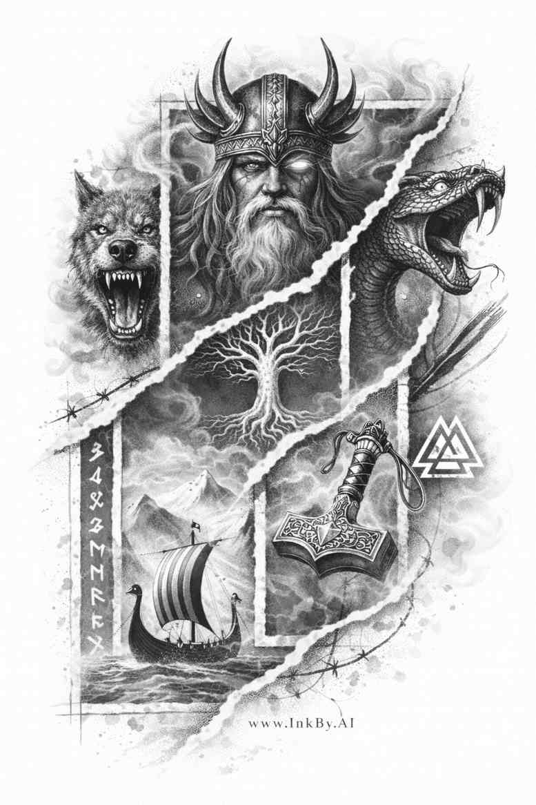 This AI-generated tattoo concept presents a bold, heavy blackwork composition that reads like a mythic panel torn along diagonal shards. The leftmost figure is a demon head with curling horns and a fierce expression, rendered with dense blacks and fine line work that convey texture in skin, hair, and leather; to the right another predator—likely a wolf—lunges forward, its silhouette locked to the first figure by the shared diagonal fracture that slices the image into fractured facets, almost like a gemstone under pressure. A sigil-like motif anchors the lower edge, its geometric restraint balancing the chaotic energy above. The design relies on stark contrasts between fully saturated blacks and carefully carved negative space, creating depth and a sense of motion as if the scene were in motion within a single frame. The geometry of the shards provides rhythm and unity across the composition, while the interplay of light and shadow enhances the three-dimensional feel of each figure. While rooted in blackwork tradition, the subject matter borrows from fantasy illustration and mythic iconography, inviting interpretation about inner conflict, protection, or duality. The overall mood is dark and cinematic, with bold outlines supporting dense fill and subtle gradient shading that keeps key details legible on skin. The visual language is designed for large-area tattooing on the arm or leg, where wraparound potential can follow the limb’s curvature and maintain readability from multiple angles. Because the piece uses heavy black ink extensively, it offers a robust foundation for a cover-up, masking prior scars or tattoos while revealing crisp silhouettes and dramatic texture in the finished work. The AI-generated nature of this concept means the layout explores unconventional pairings and a mythic storytelling vibe, providing a fresh take on demon and beast iconography suitable for collectors who favor high-contrast, statement tattoos.